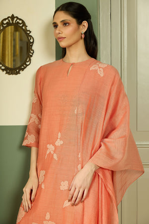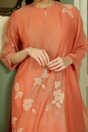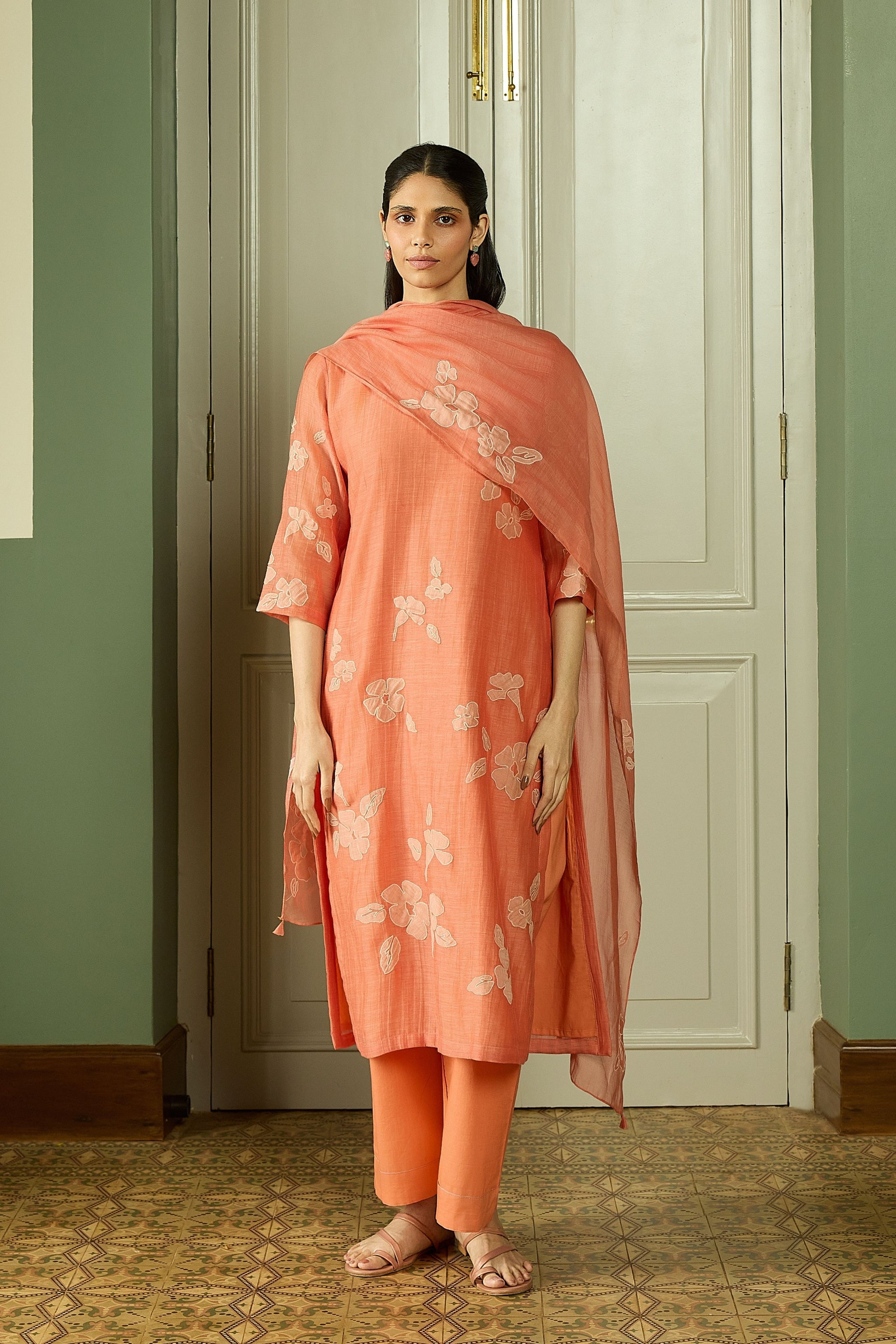 • Tangerine applique kurta set is adorned with delicate blooms scattered at the front of the kurta and sleeves, lending a soft texture to the piece. Paired with matching pants and dupatta with co-ordinated detailing, the ensemble feels light, easy, and effortless.
