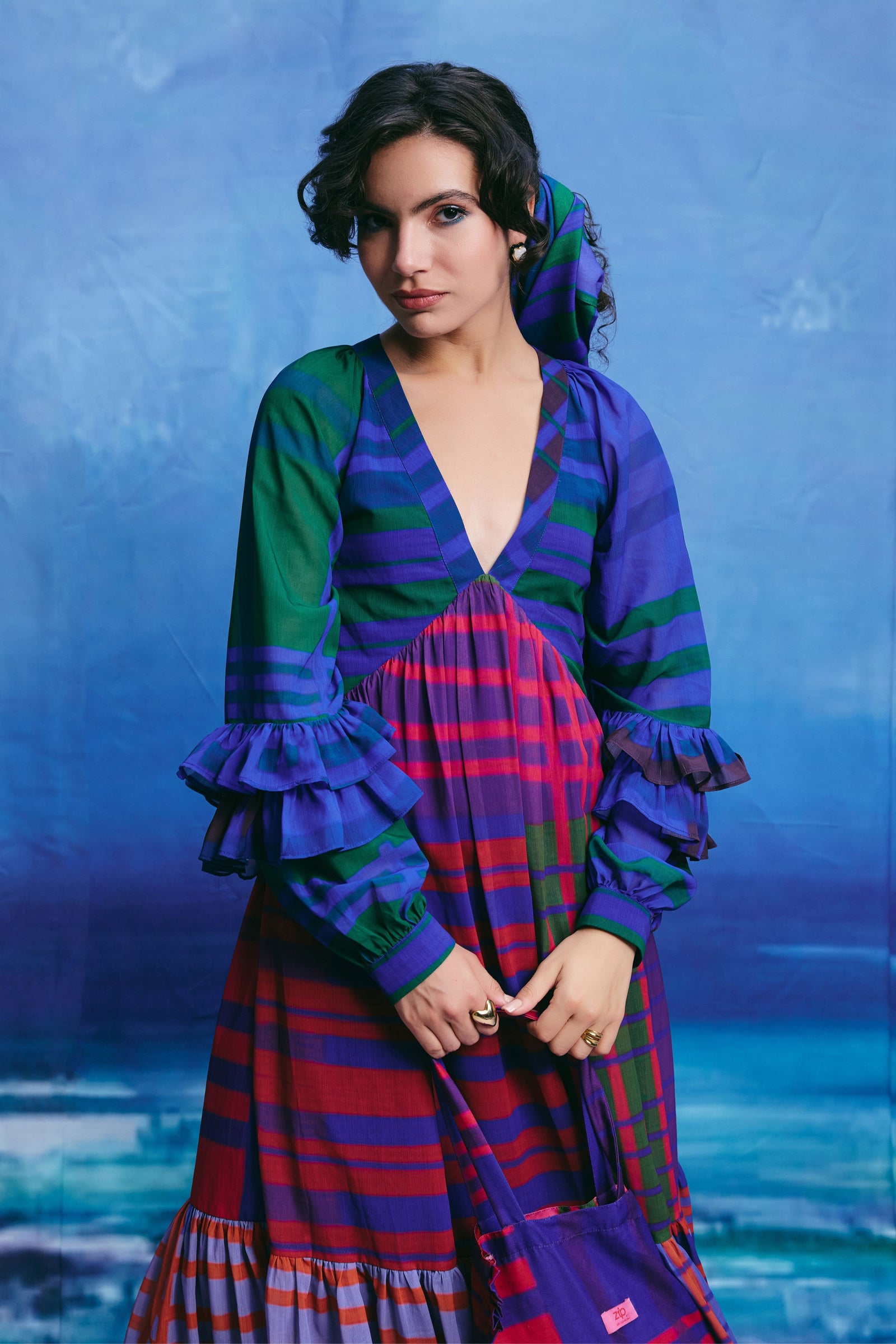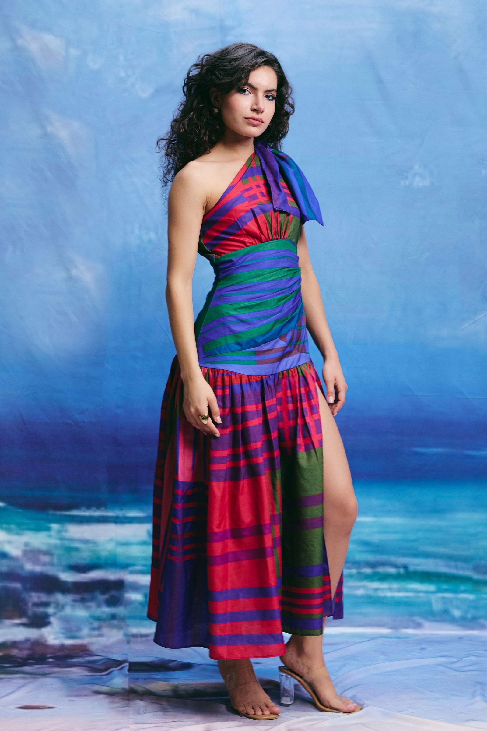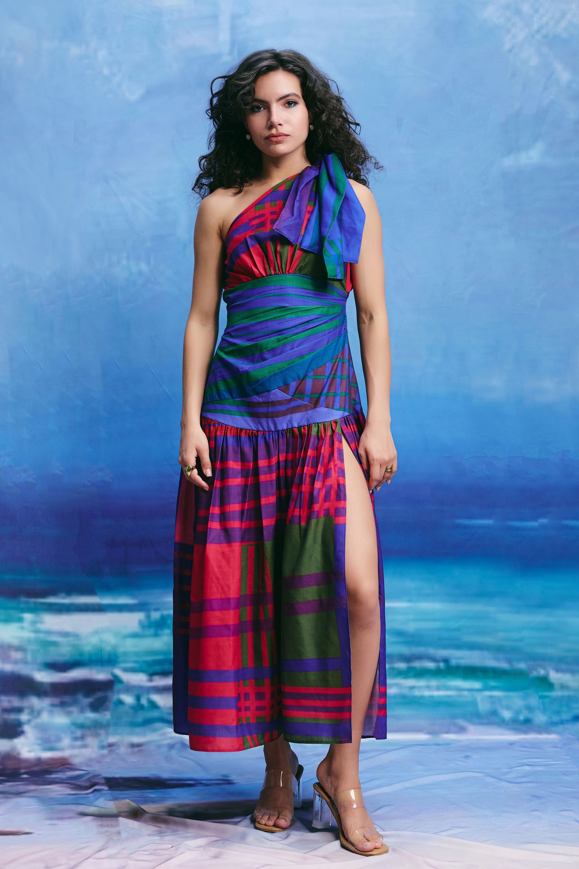 • This dress is a great pick for a celebratory soiree. Dipped in vibrant hues, its beauty is accentuated by the ruffles moving towards one shoulder. The dress features layers and gathers that cascades to the flattering hemline.
