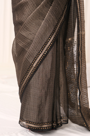 • Gold tissue striped base, woven sequins border and chevron pattern on the pallu saree: approx. 5.65M (l) x 46.5"" (W) blouse: approx. 1M unstitched black matka silk fabric with gold stripes (woven with the saree)