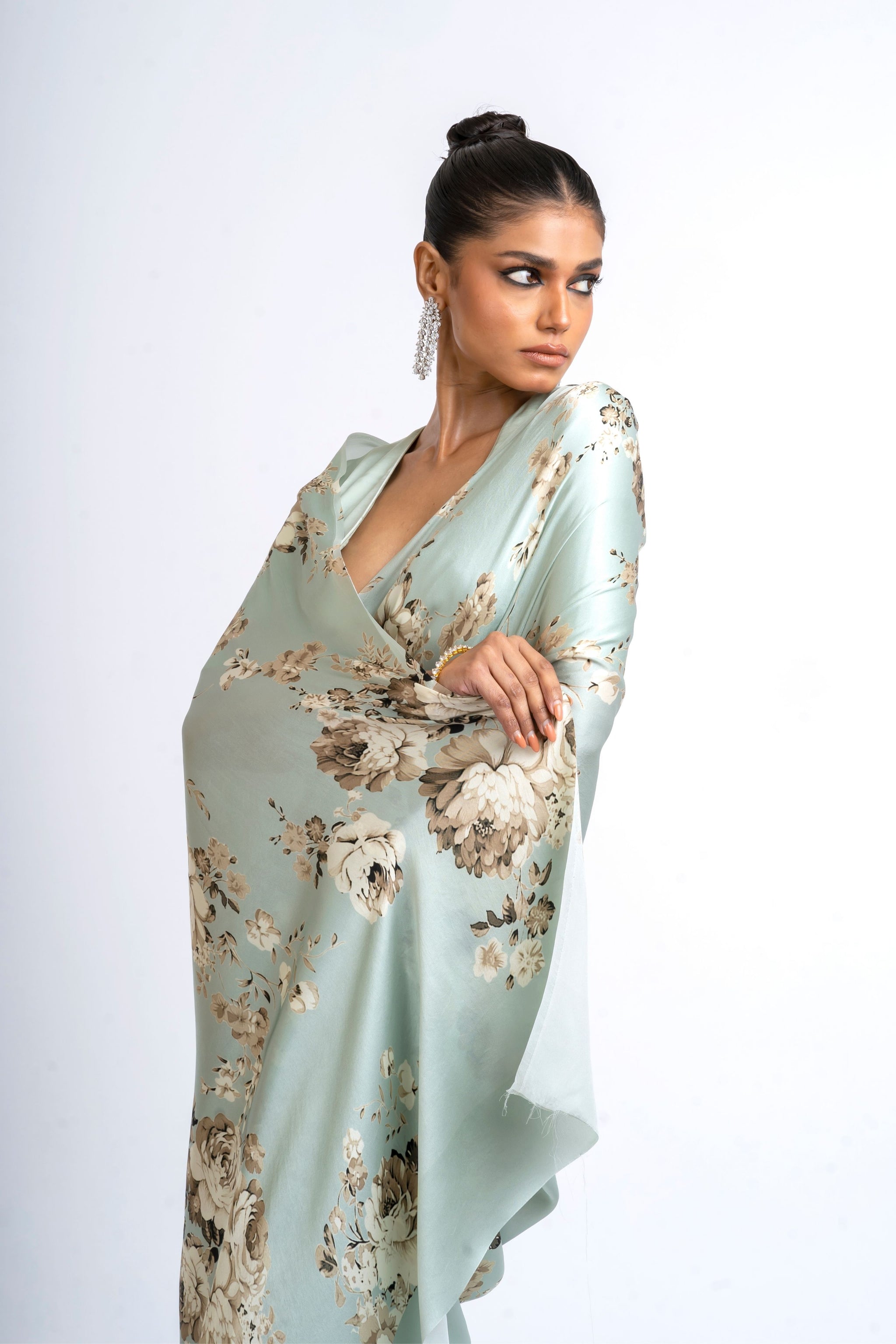 • This pure satin silk saree, with its classic pearl blue base and bold abstract floral design, is a canvas for vibrant, digitally rendered hues. The interplay of colors against the soft background creates a stunning visual impact.