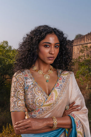 • A perfect blend of heritage and contemporary allure, our ombre saree is a festive favourite. The intricate marodi work on the border and blouse is a celebration of ancient artistry. Perfect for any festive occasion.