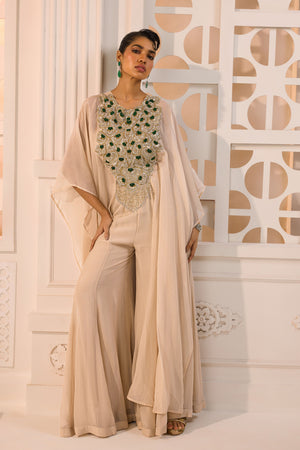 • This striking ivory-beige ensemble features a floor-length, flowing cape anchored by a majestic bib of hand embroidered emerald-toned stones and intricate gold embroidery paired with a flared sharara. It is an ode regal modernism, offering a high-drama silhouette that transitions seamlessly from an editorial set to a grand celebratory evening.