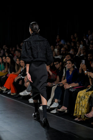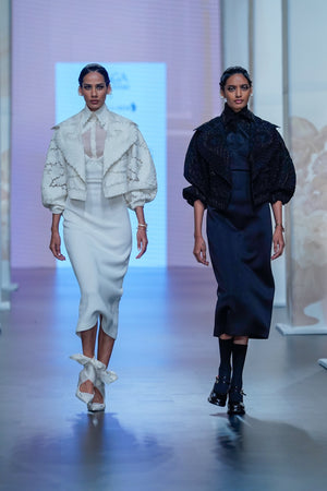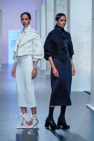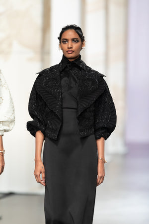 • Pearlesque cord-work | Hand detailing | Encrusted cropped jacket | Double-breasted | Shawl collar | Voluminous sleeves | Jacket: 20"