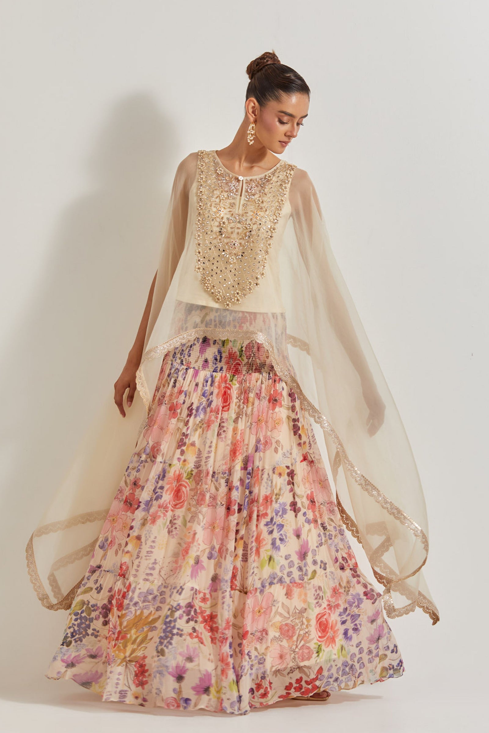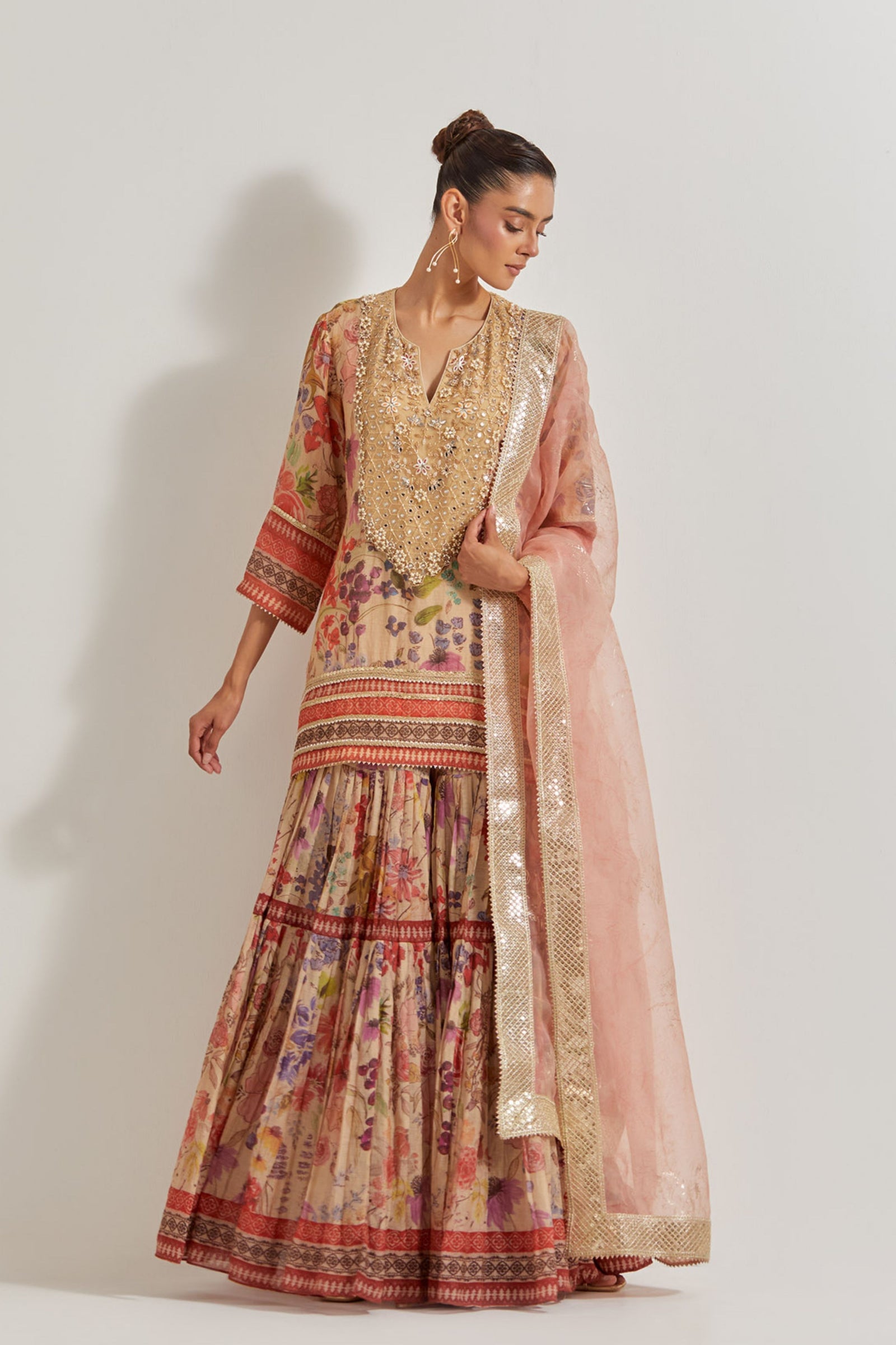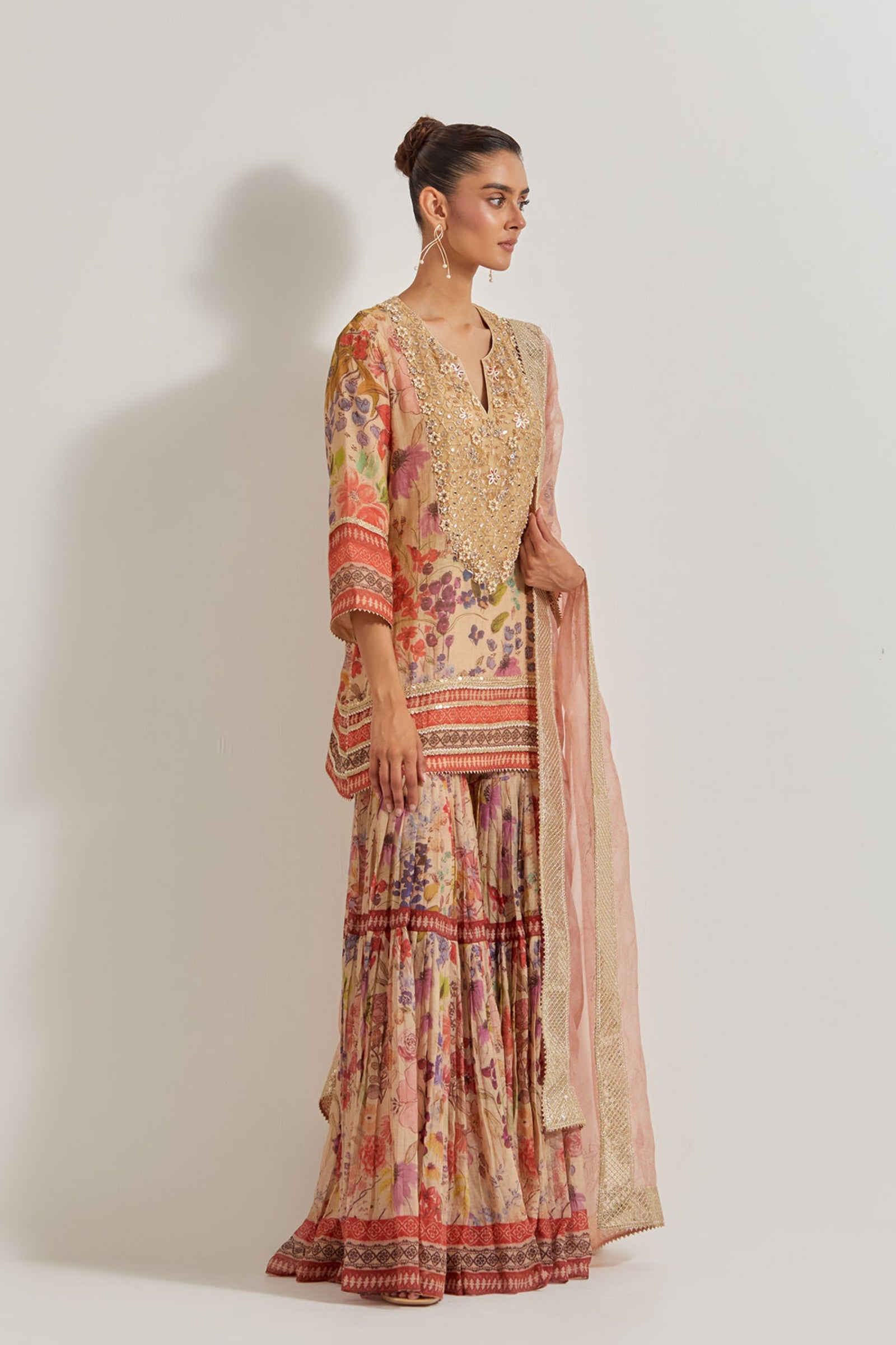 • Blooming burst tissue chanderi sharara set with hand embellished neckline