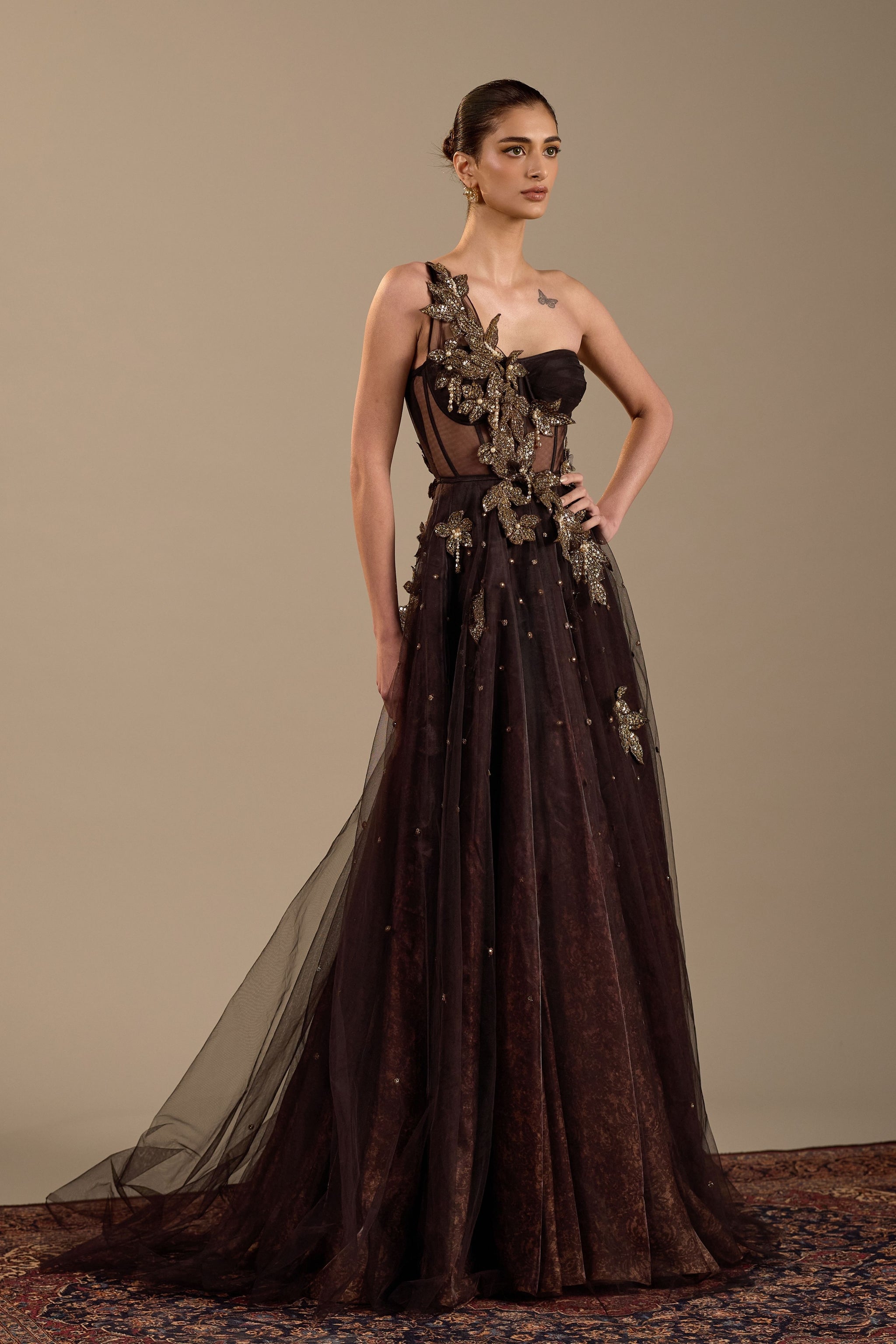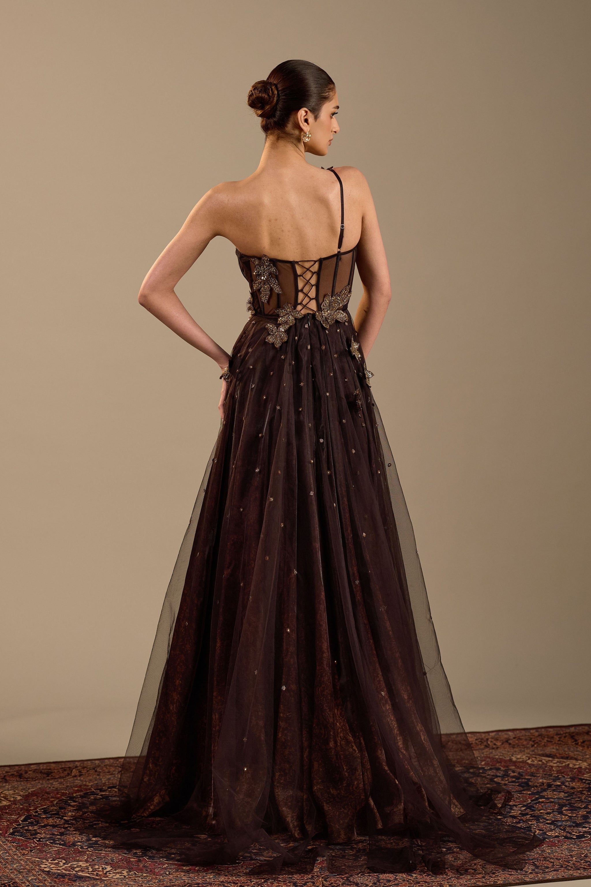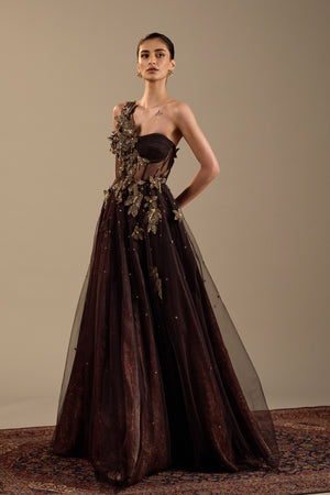 • Featuring dark brown corset gown. It is enhanced with hand embroidered floral details.