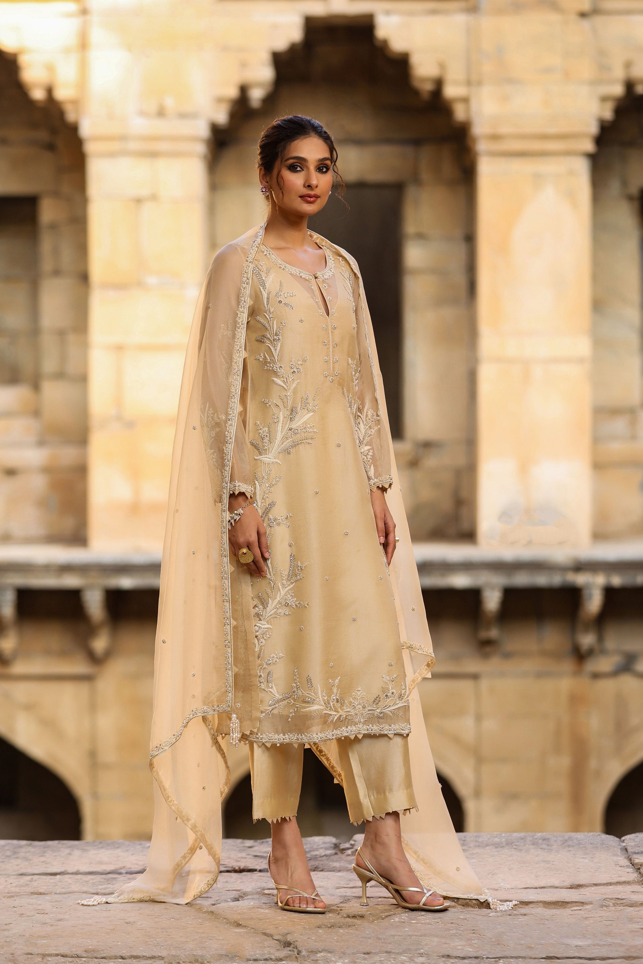 • This kurta set features heavy resham and pearl embroidery all over the kurta. The dupatta is enhanced with a heavy embroidered border and butis all over. It is paired with straight pants with detailing at the hem.