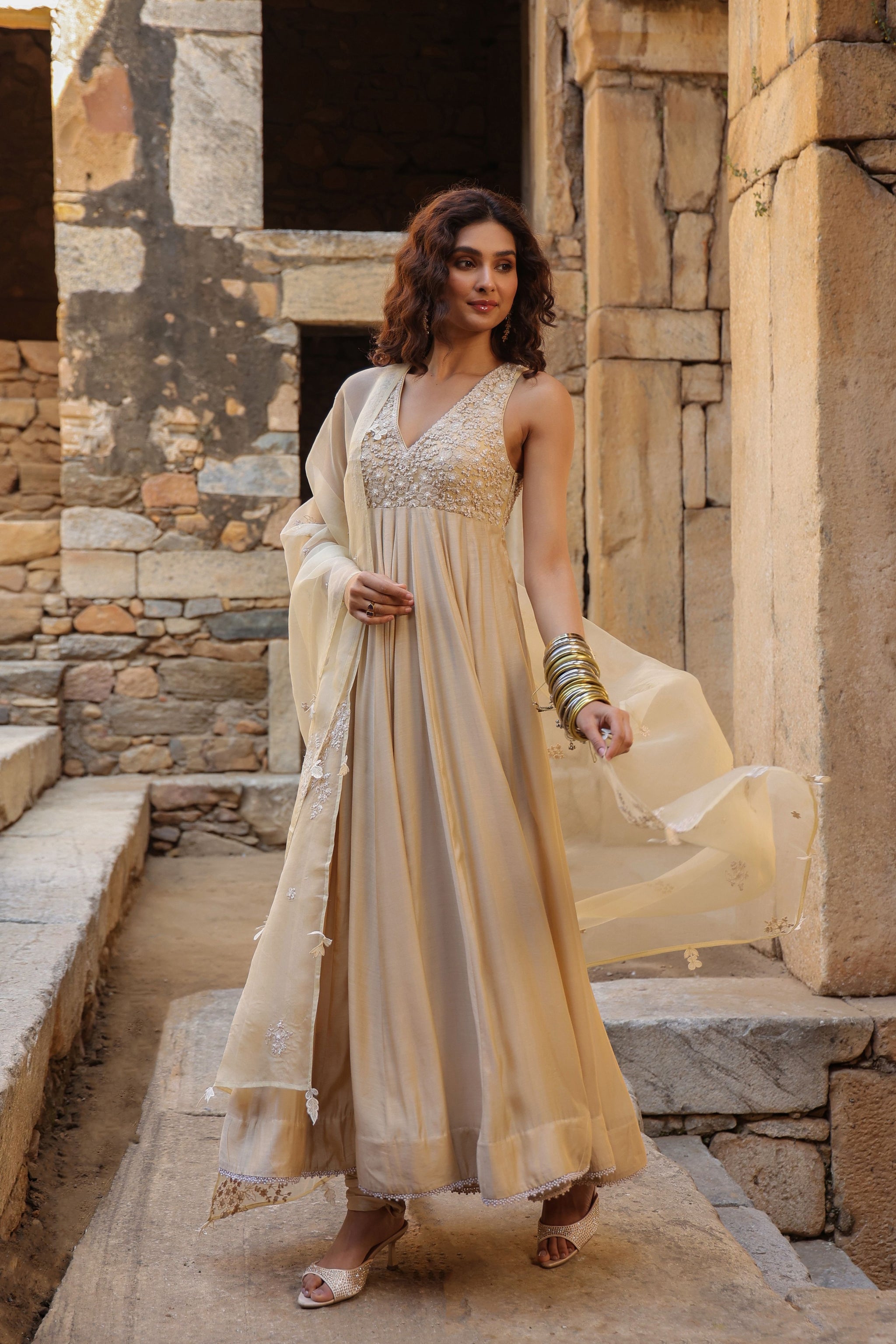 • This sleeveless kalidar set features heavy applique and pearl embroidery at the yoke with pearl detailing at the hem. It is paired with an embroidered dupatta and plain churidar.