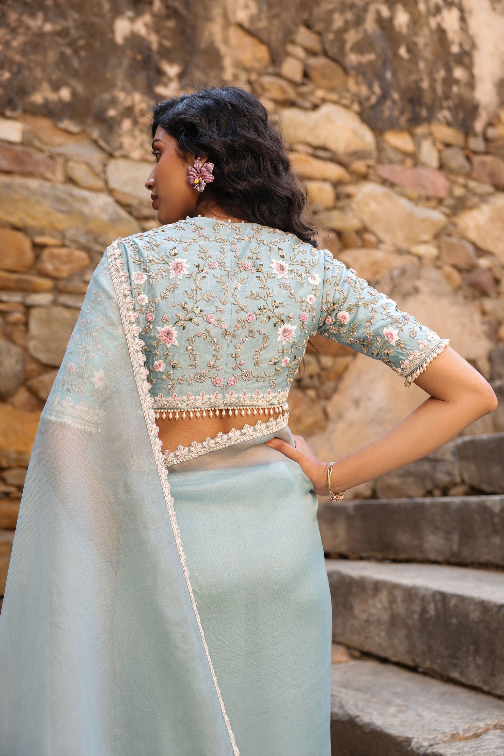 • This saree set features delicate zardosi, resham and pearl embroidery on the pallu of the saree. It is paired with a heavy embroidered blouse with pearl hangings at the hem and sleeves.