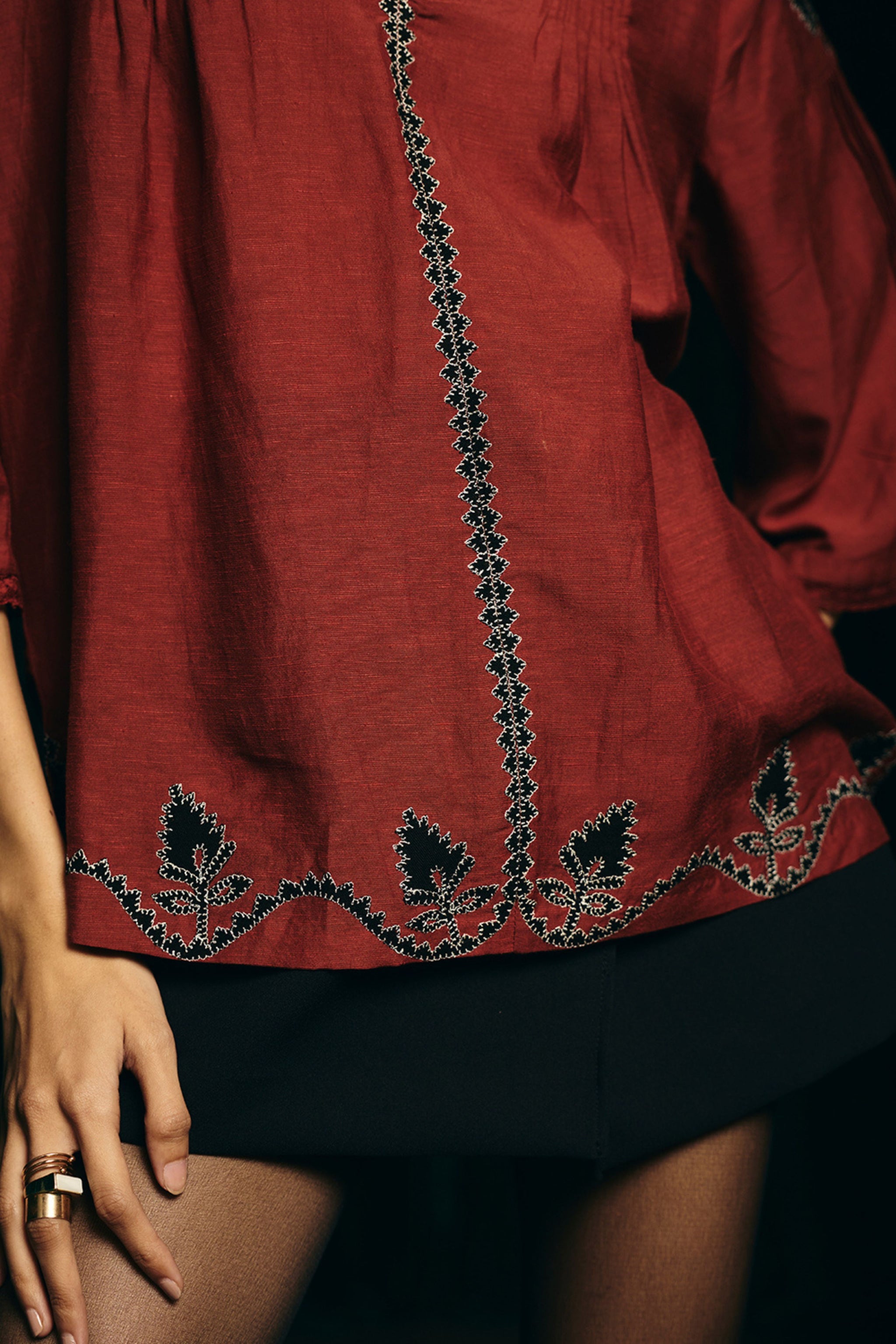 • The Valentina Embroidered Pintuck Blouse in red features a breathable linen-blend base, elevated with contrast appliqué and fine hand treadle embroidery. Lace edging and soft pintucks introduce delicate texture, while relaxed sleeves ensure a comfortable, easy wear.