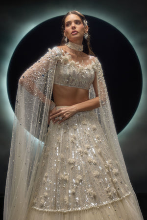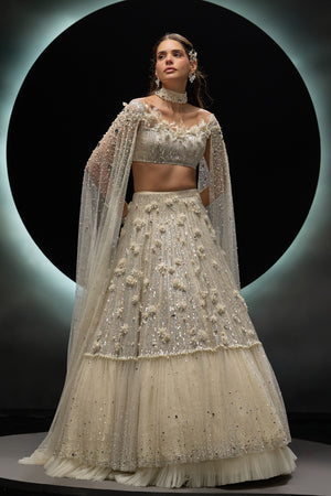 • Ivory sequins hand embroidered lehenga & organza bustier