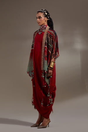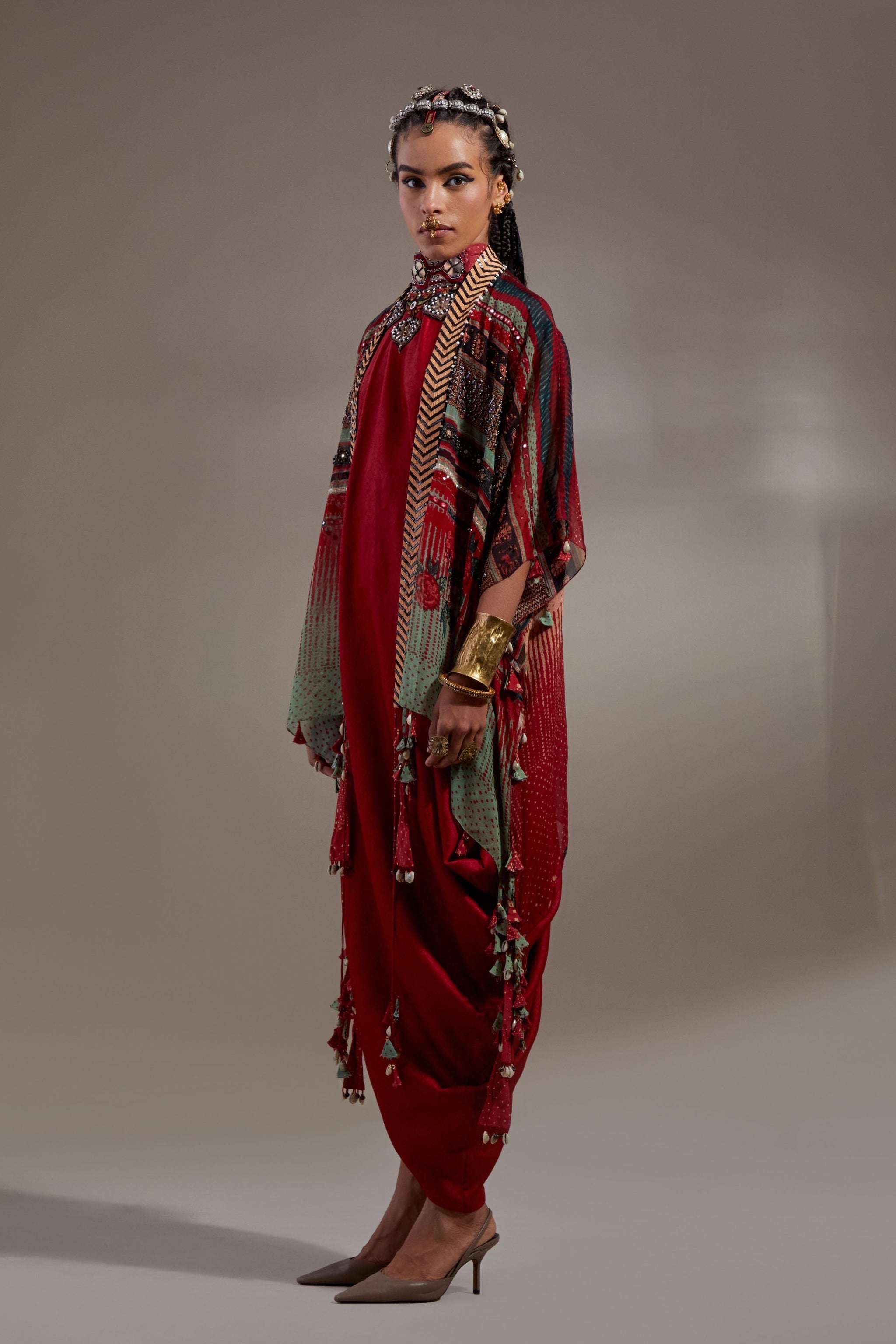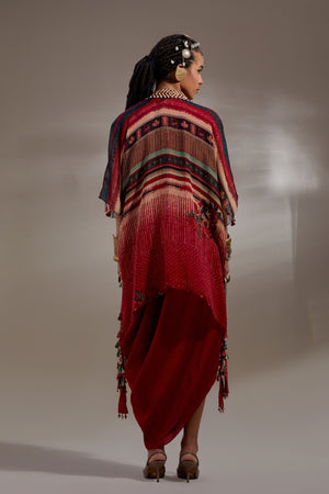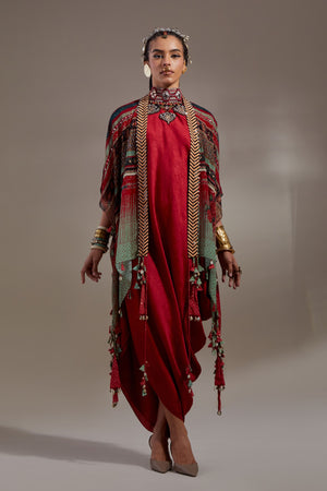 • Embroidered and printed free-size jacket with tribal tassel details. Paired with solid textured drop shoulder drape dress with embroidered detailing at neck with back tie up. Jacket-front- 27.5" Back- 31.5" Dress length - 56"