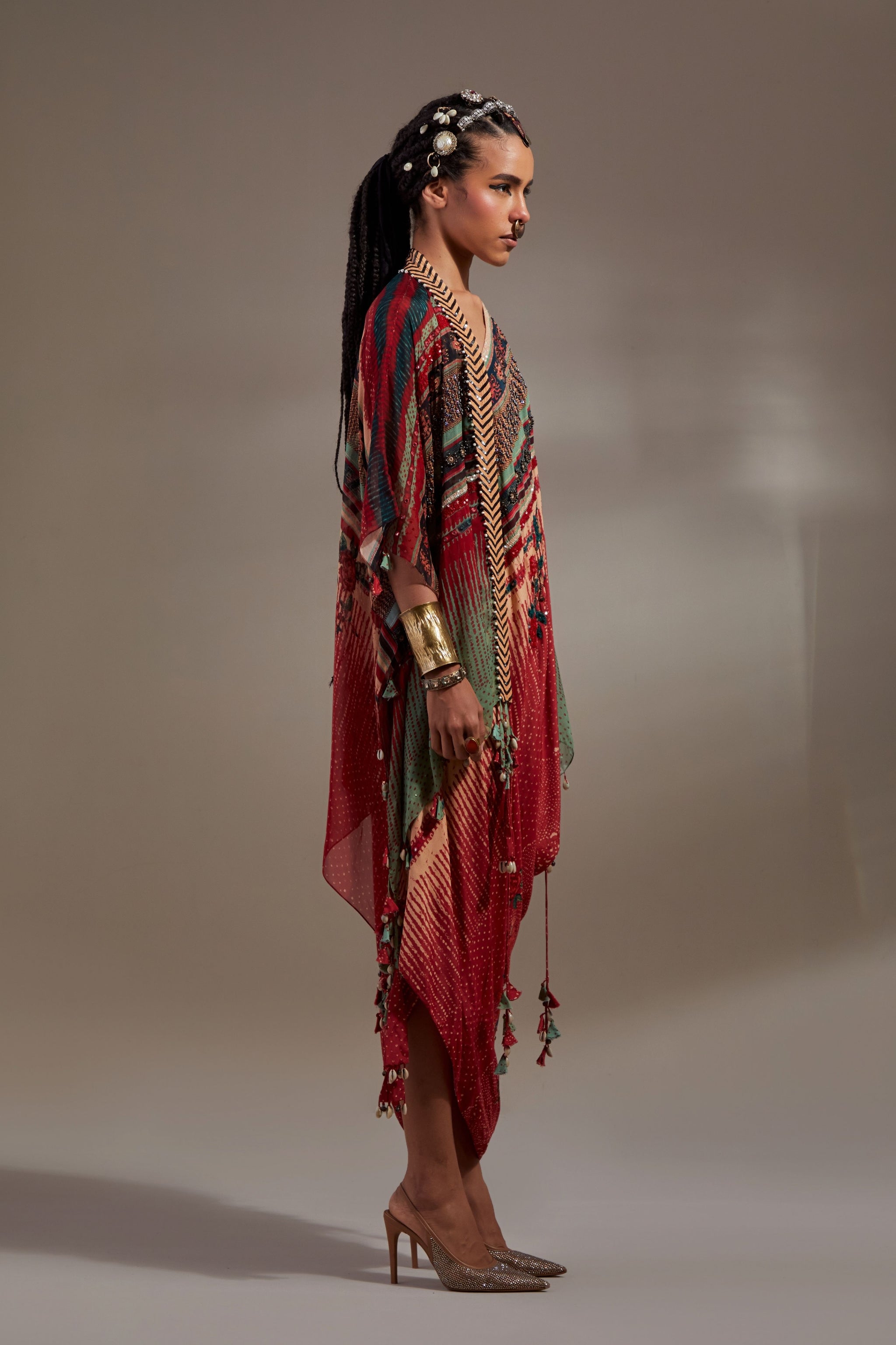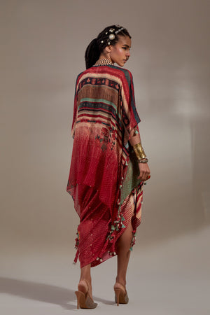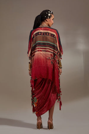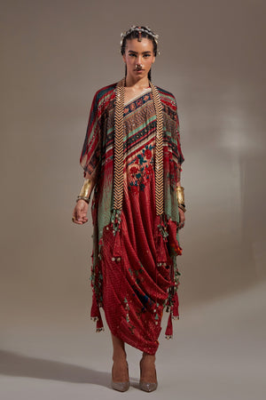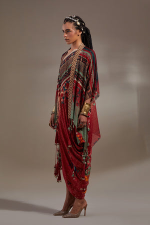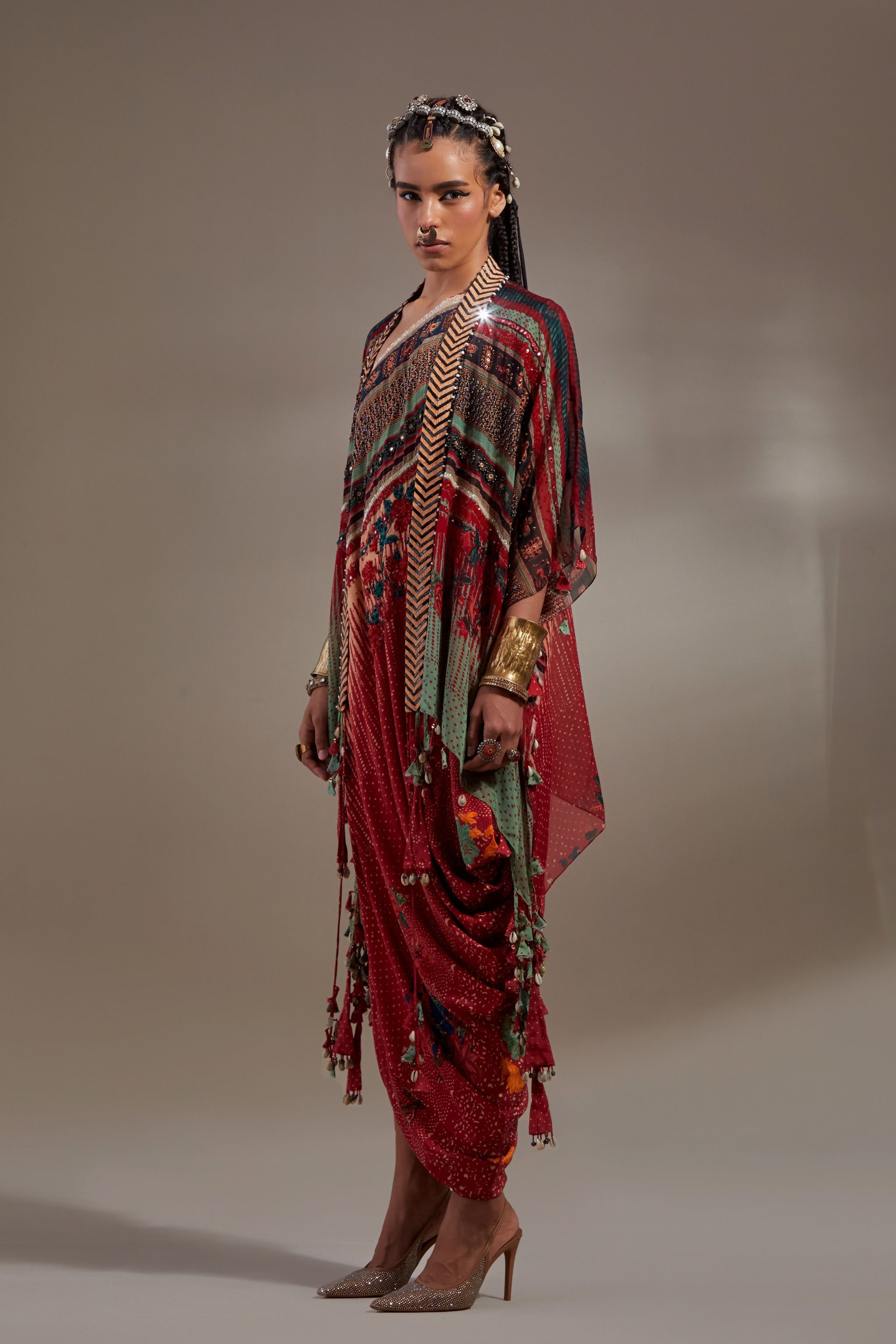 • Printed one-shoulder drape dress with embroidered detailing at the yoke. Free-size jacket – front: 27.5", back: 31.5"