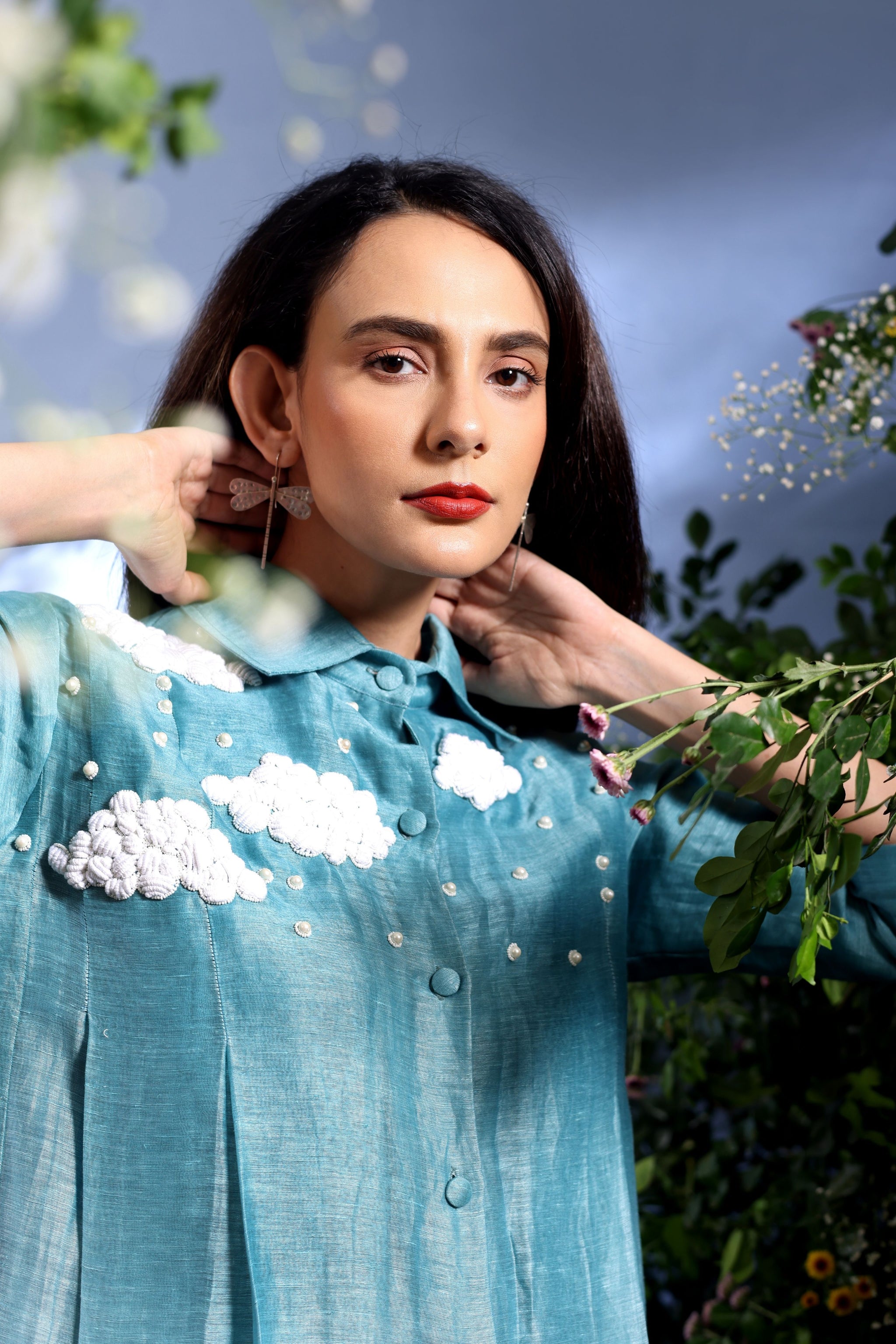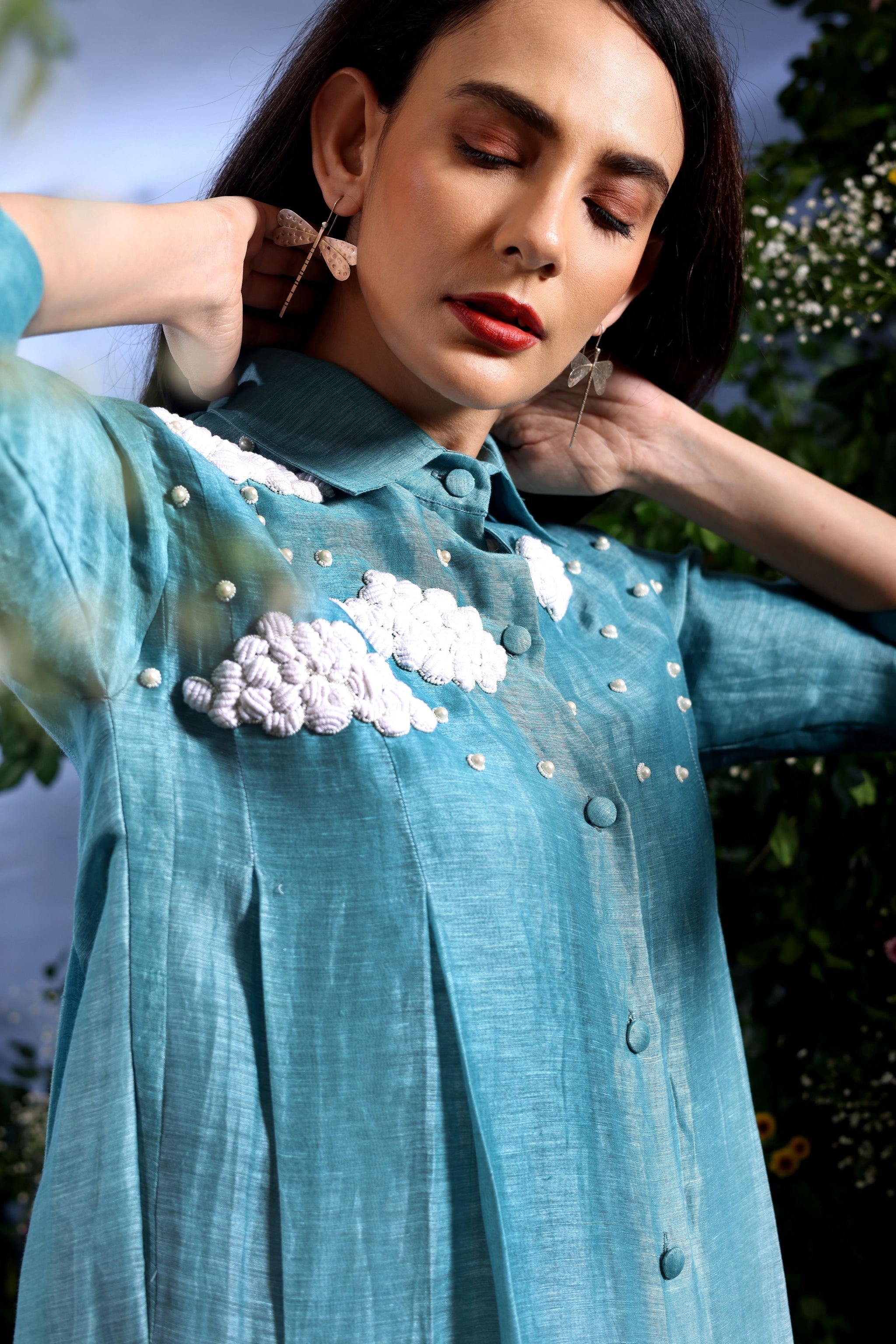 • This elegant co-ord set features a pure linen long buttoned shirt, adorned with intricate threadwork embroidery inspired by drifting clouds. Rendered in an off-white and sky blue dual-shade ombré, the colour gently fades from bottom to top, evoking a sense of lightness and calm. Paired with pure linen flared trousers, the ensemble offers a relaxed, airy silhouette that blends natural textures with understated sophistication—perfect for warm, sunlit days.
