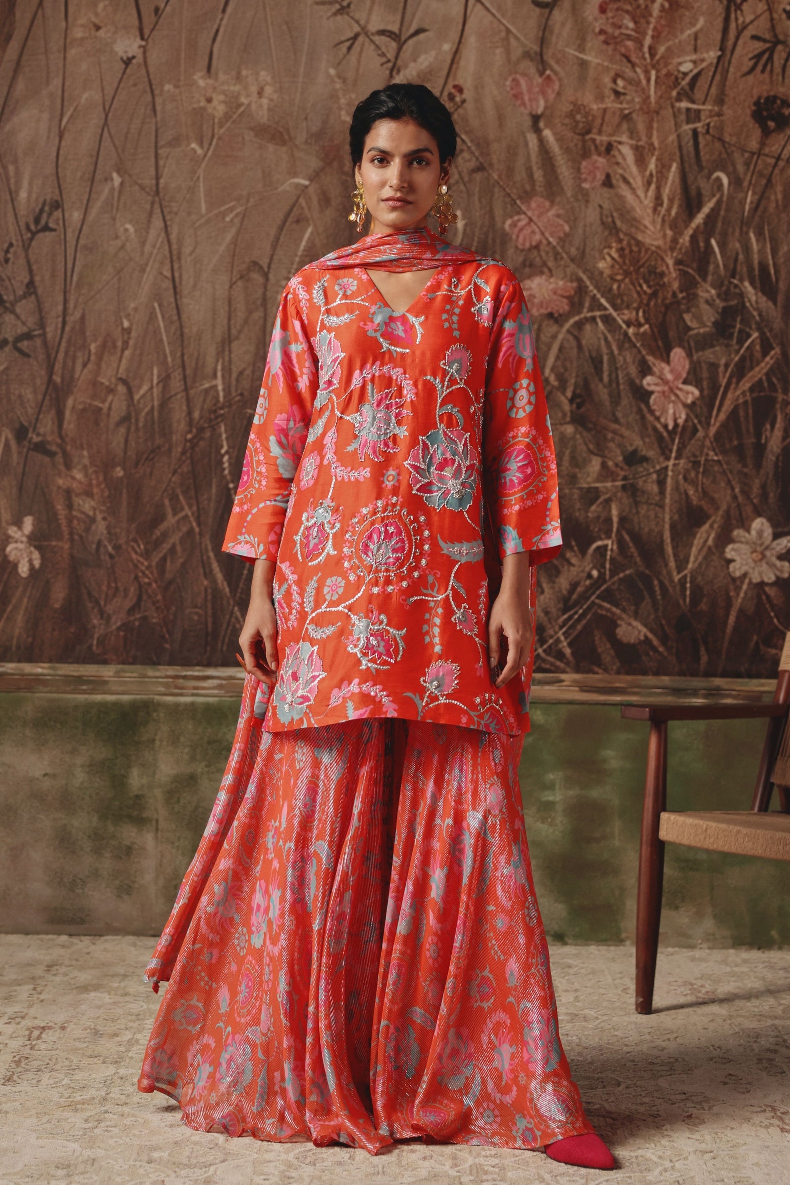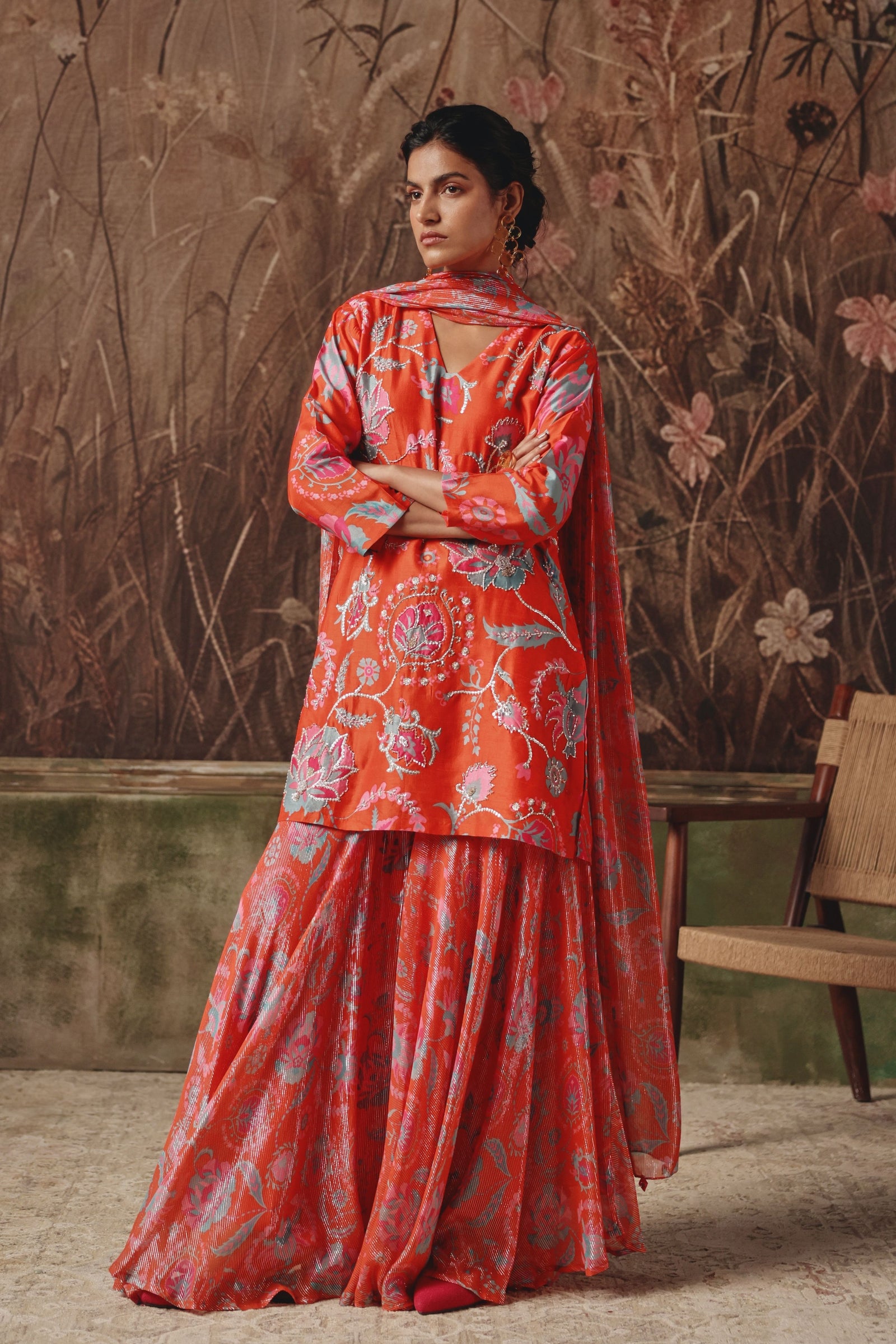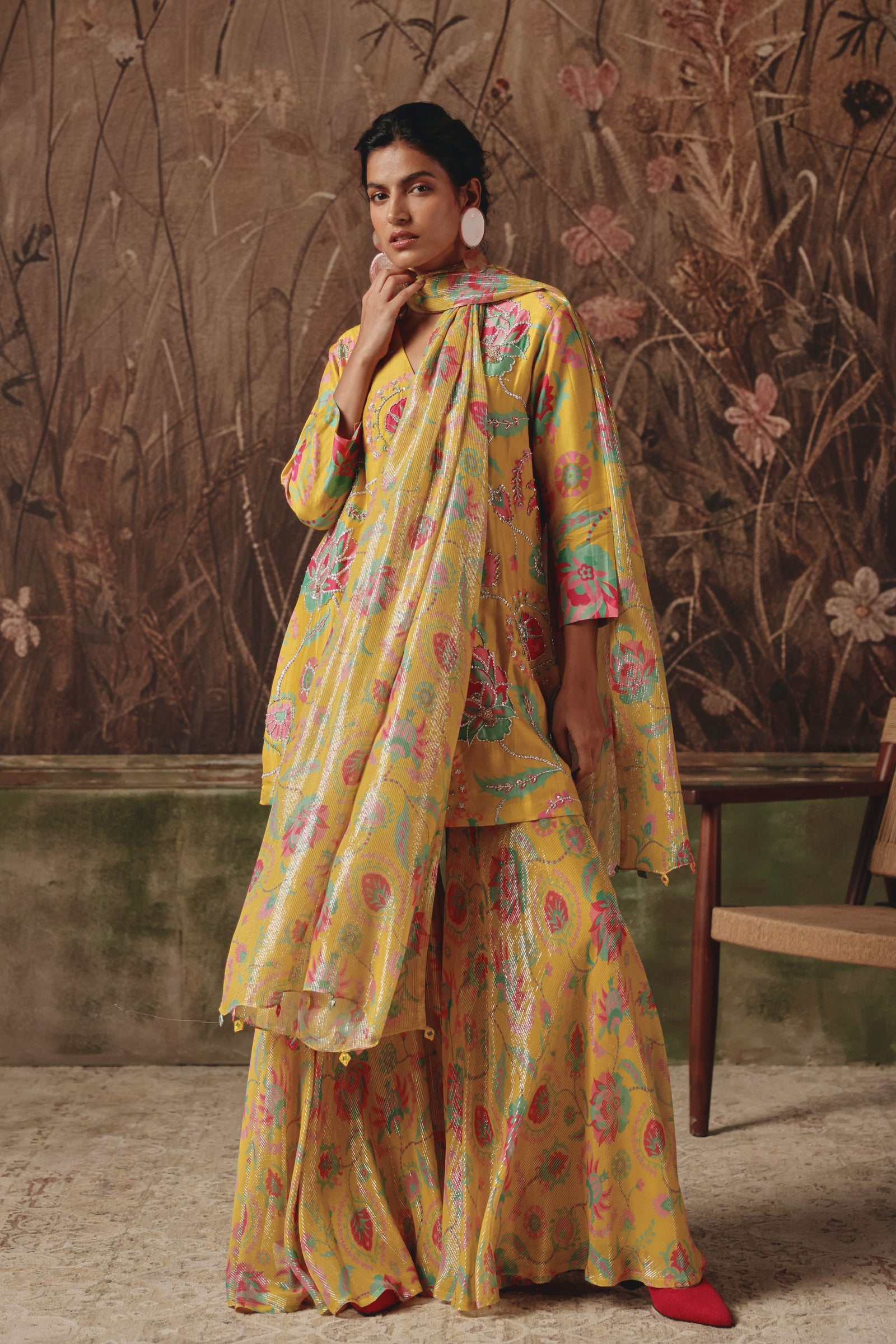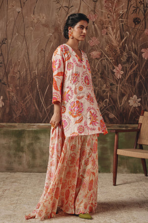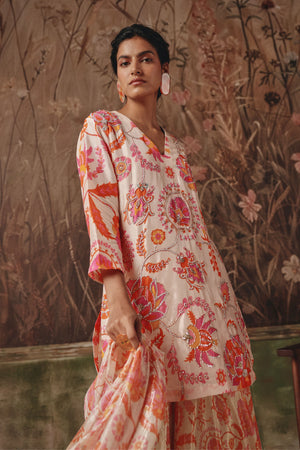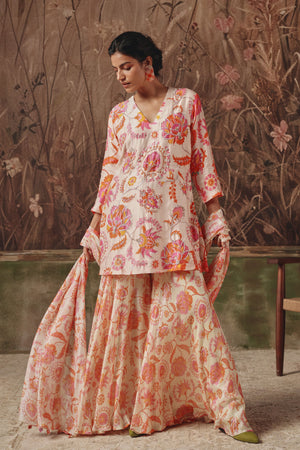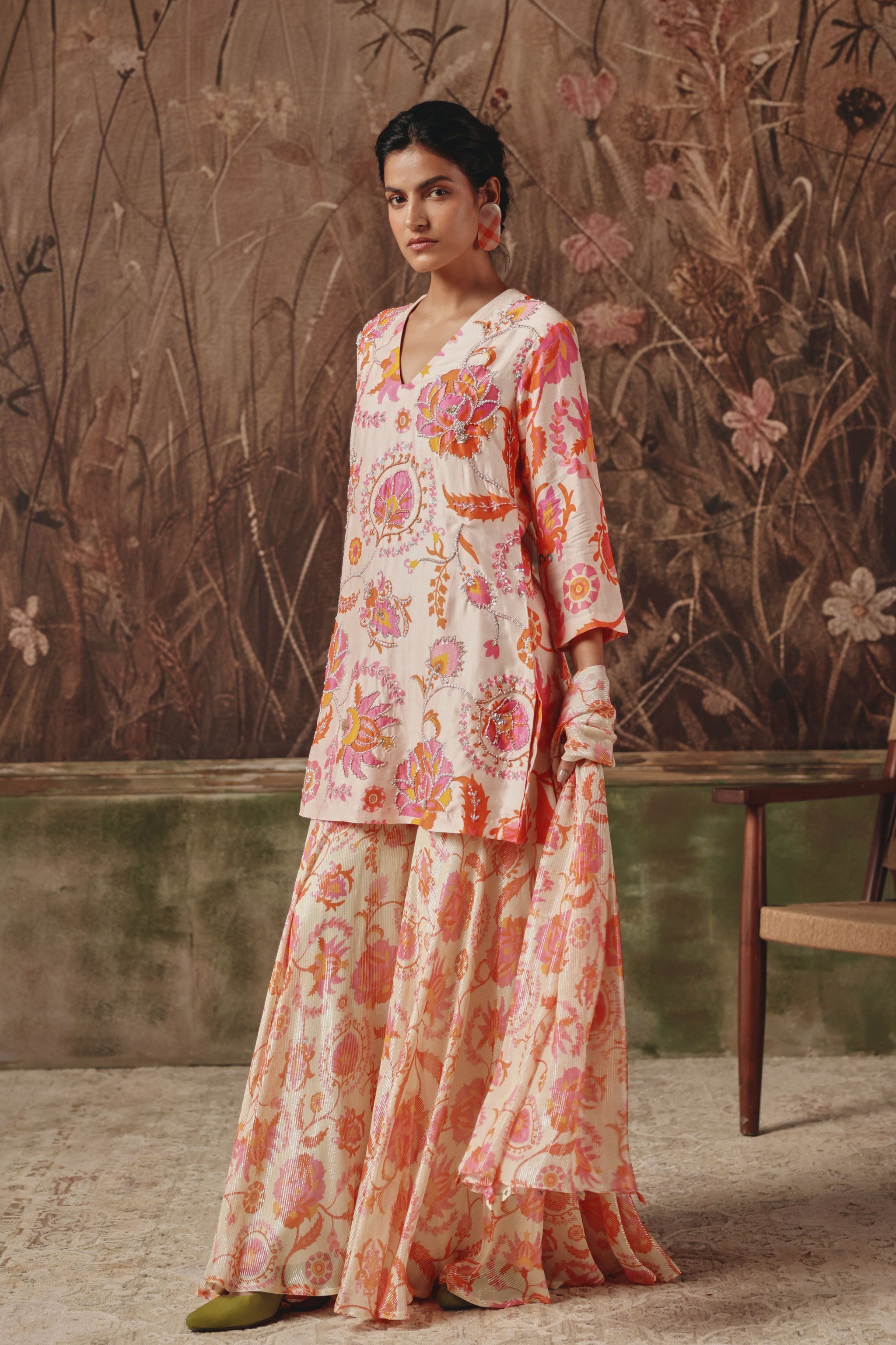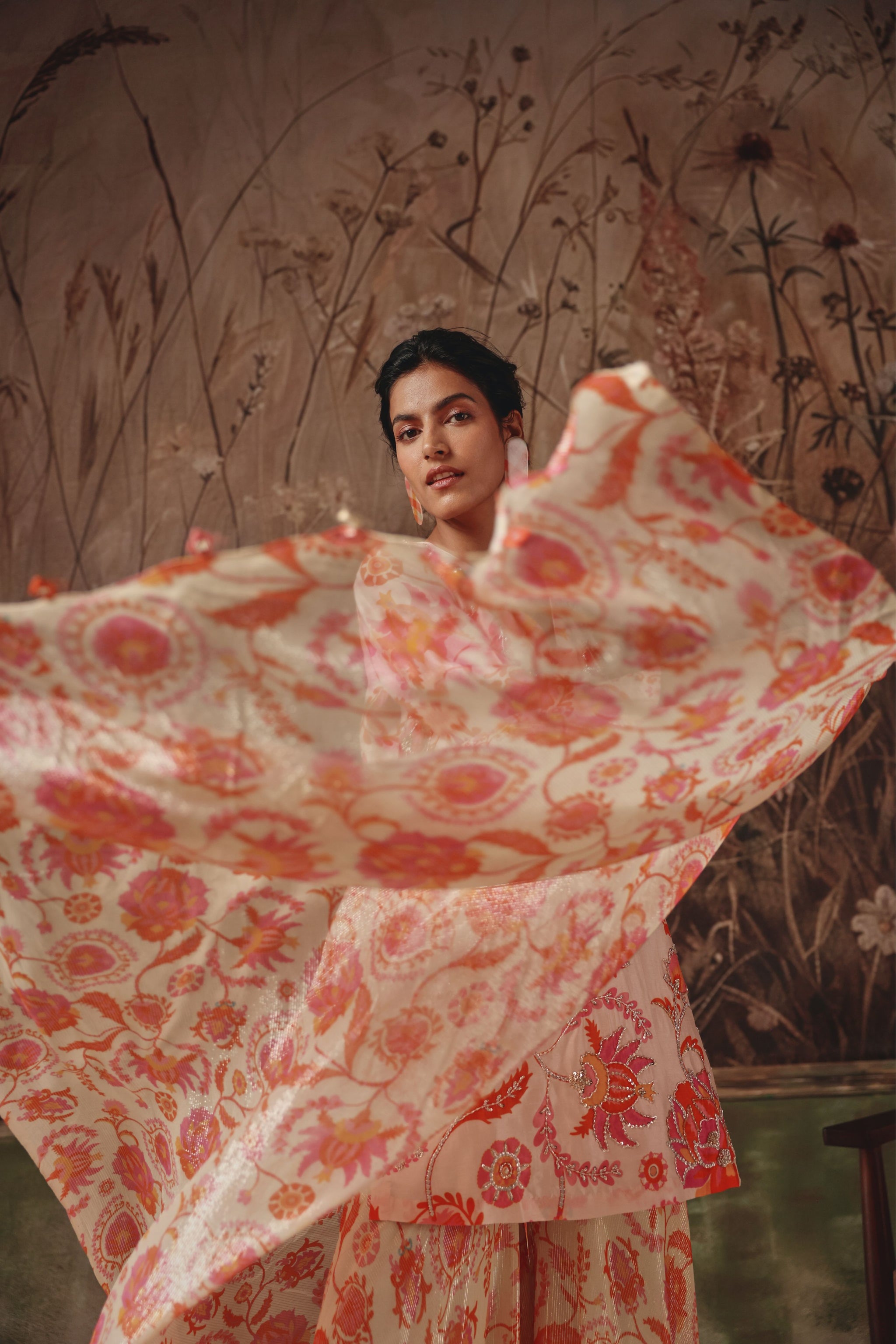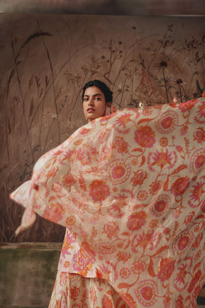 • An ode to petals carried across silk road winds, this ivory-toned kurta set brings soft colour and lyrical florals into a fluid silhouette. The kurta meets a free-flowing sharara and a sheer dupatta, creating a look that feels weightless yet full of story.