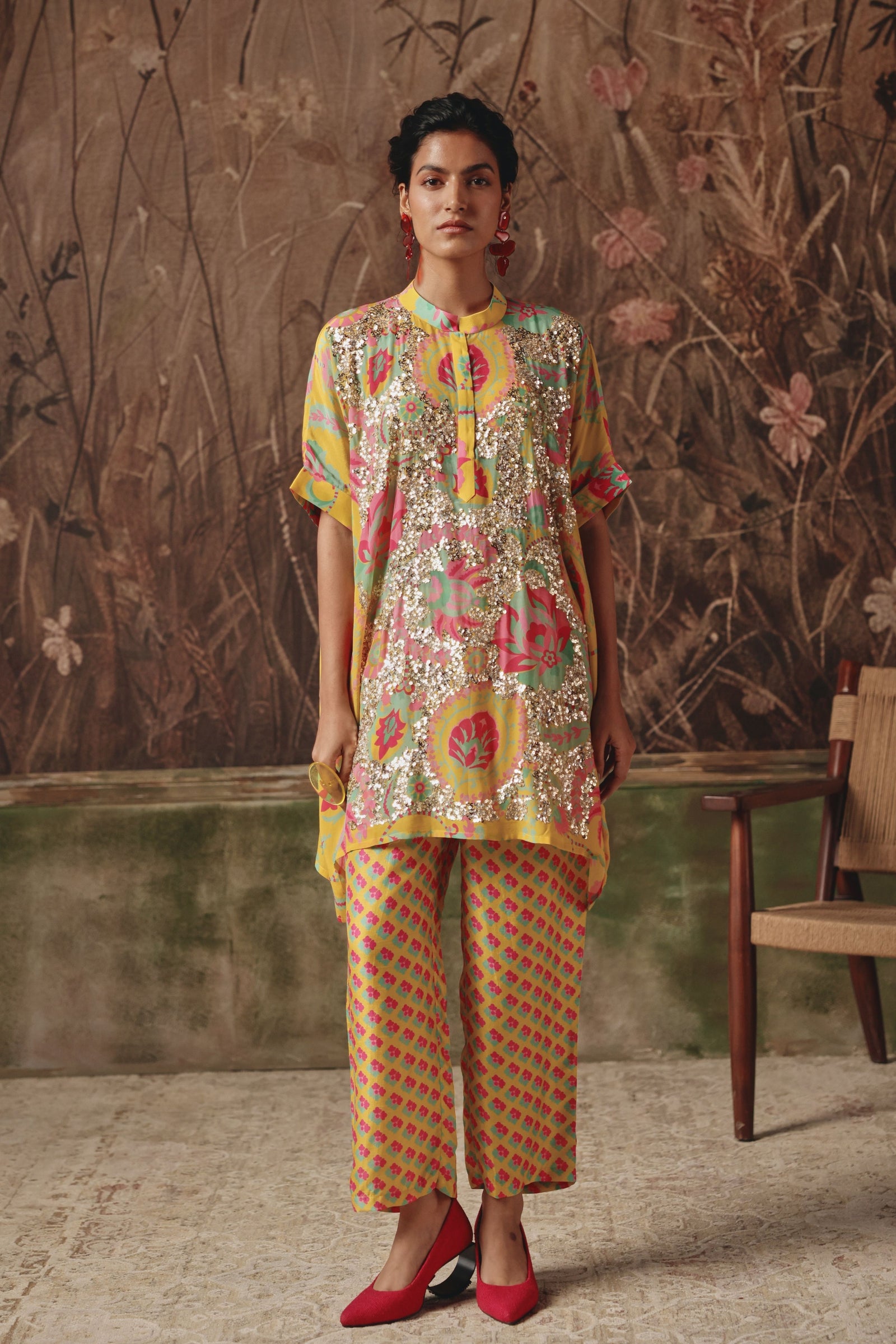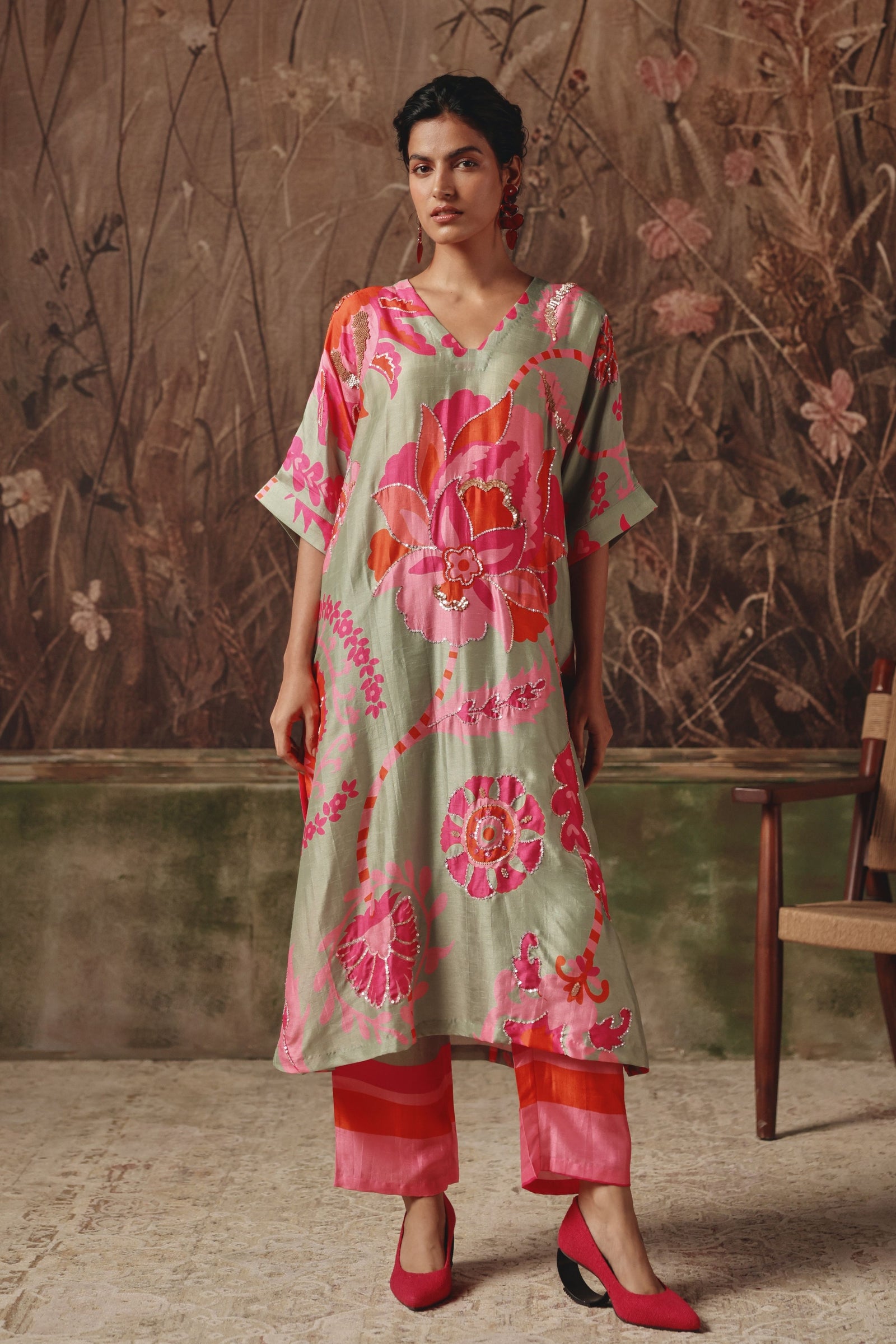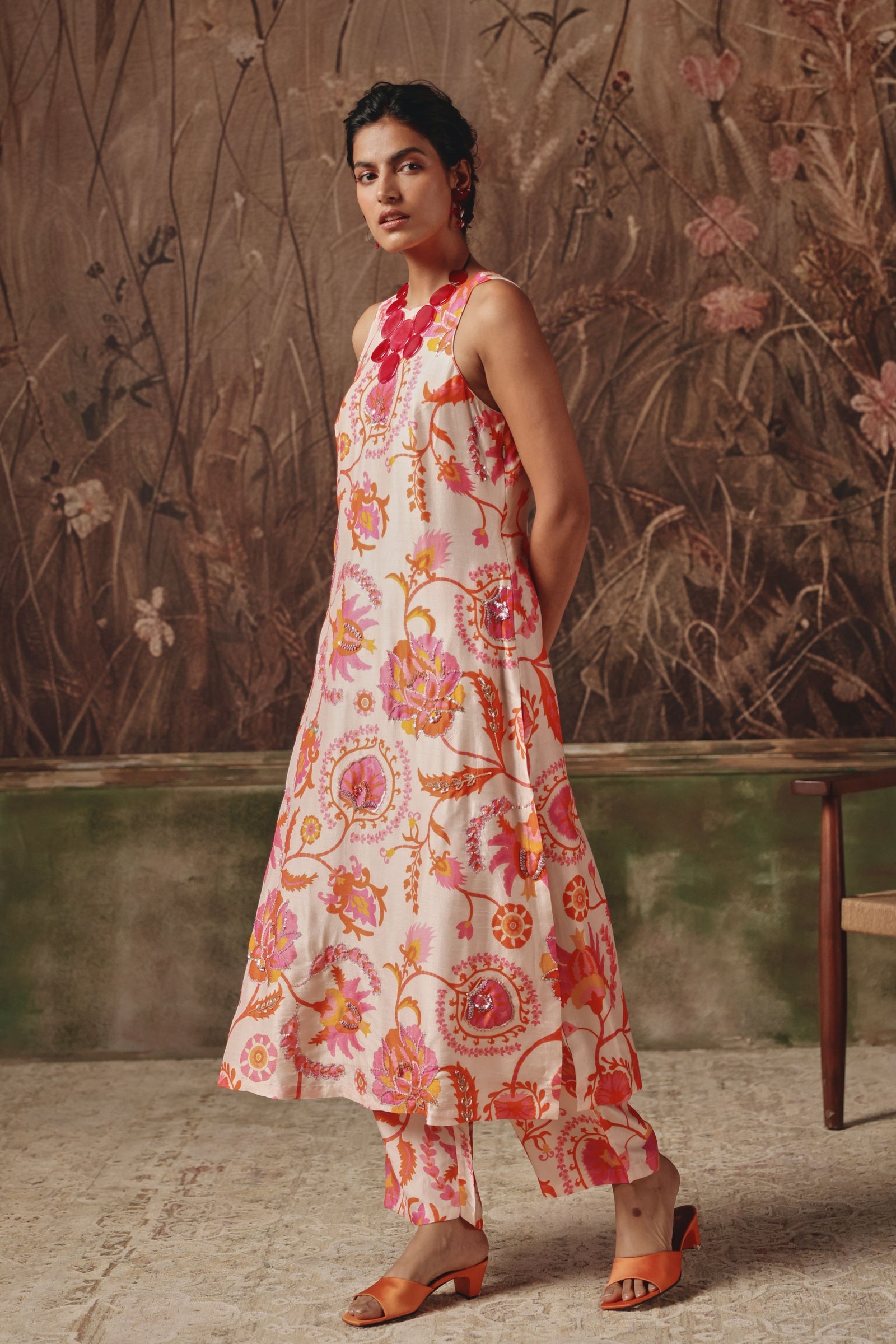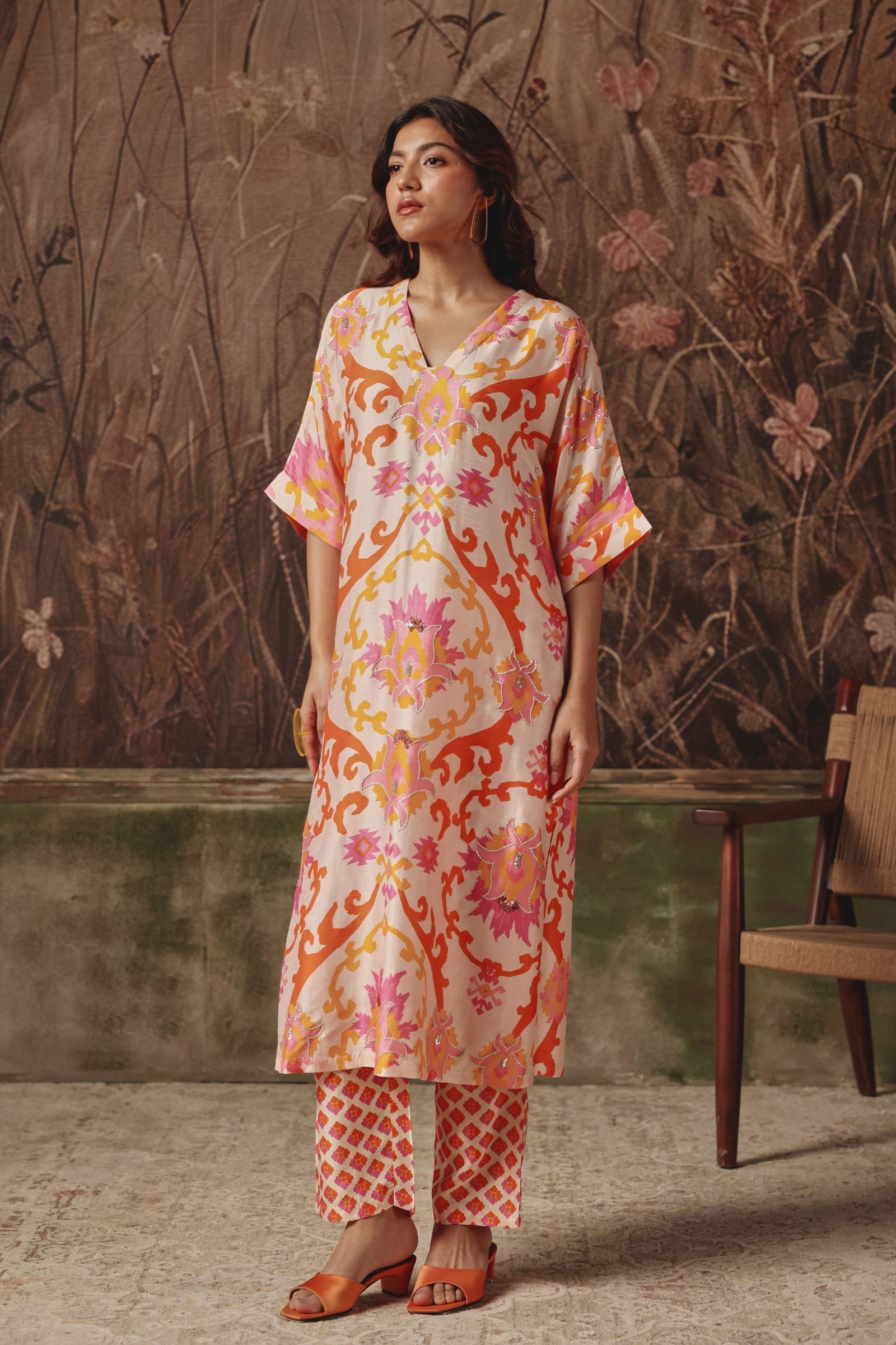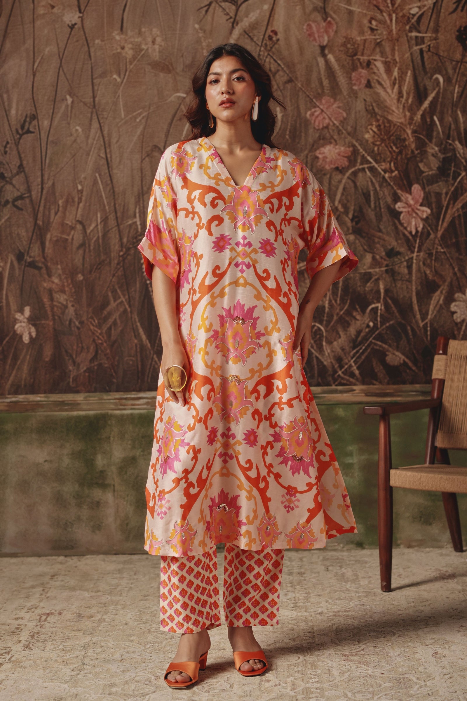 • An ode to petals carried across silk road winds, this ivory-toned kurta set brings soft colour and lyrical florals into a fluid silhouette. The kurta meets a free-flowing sharara and a sheer dupatta, creating a look that feels weightless yet full of story.