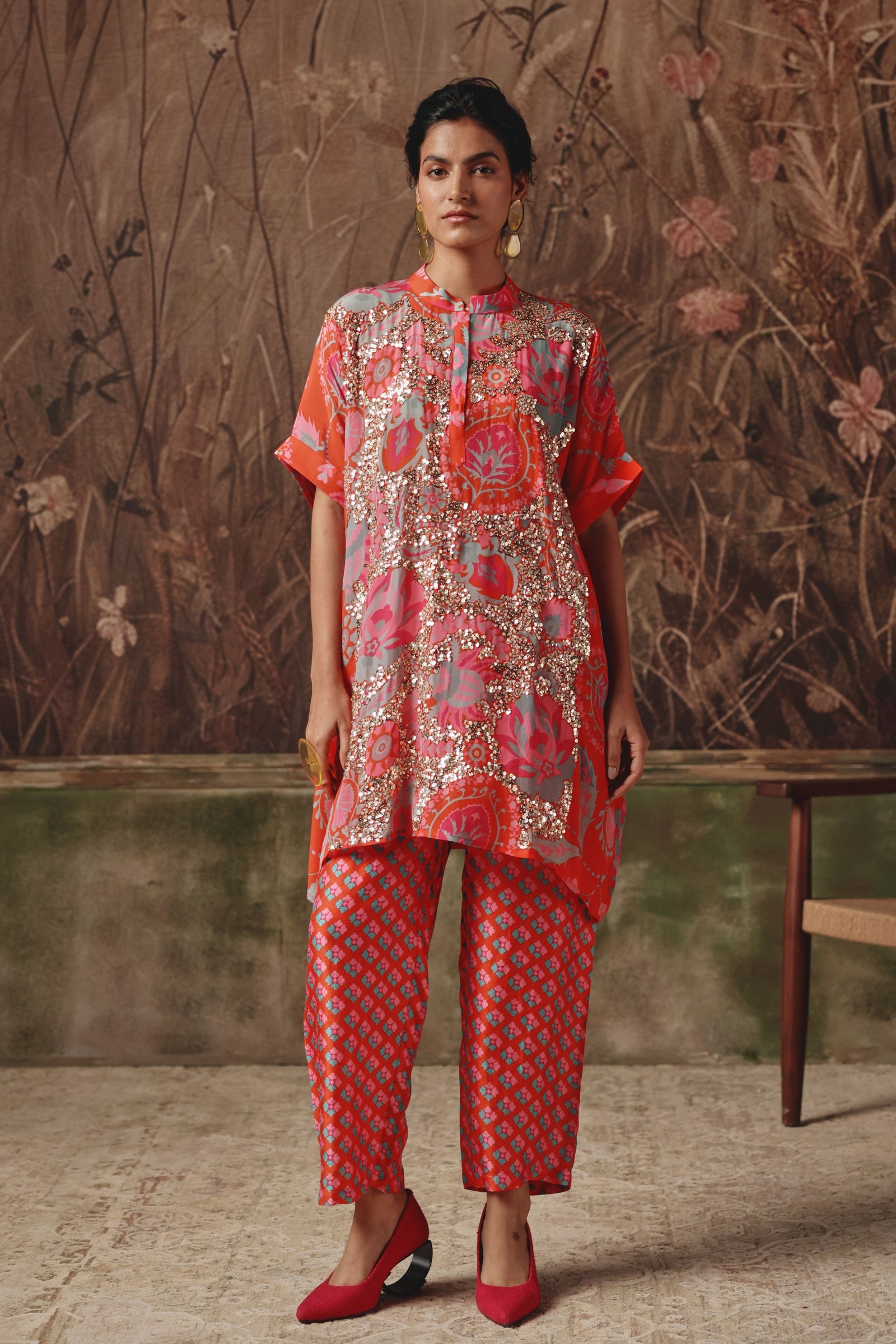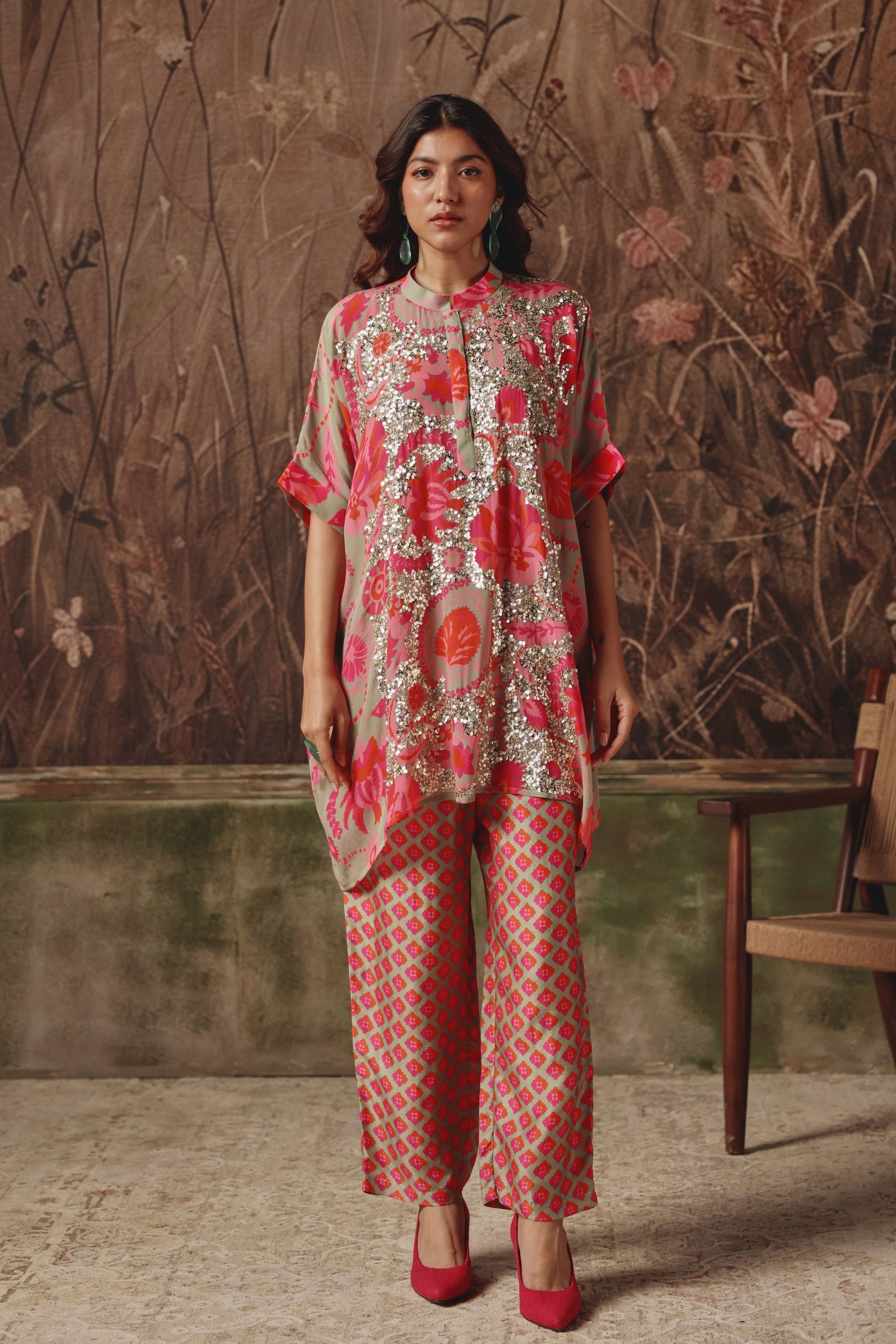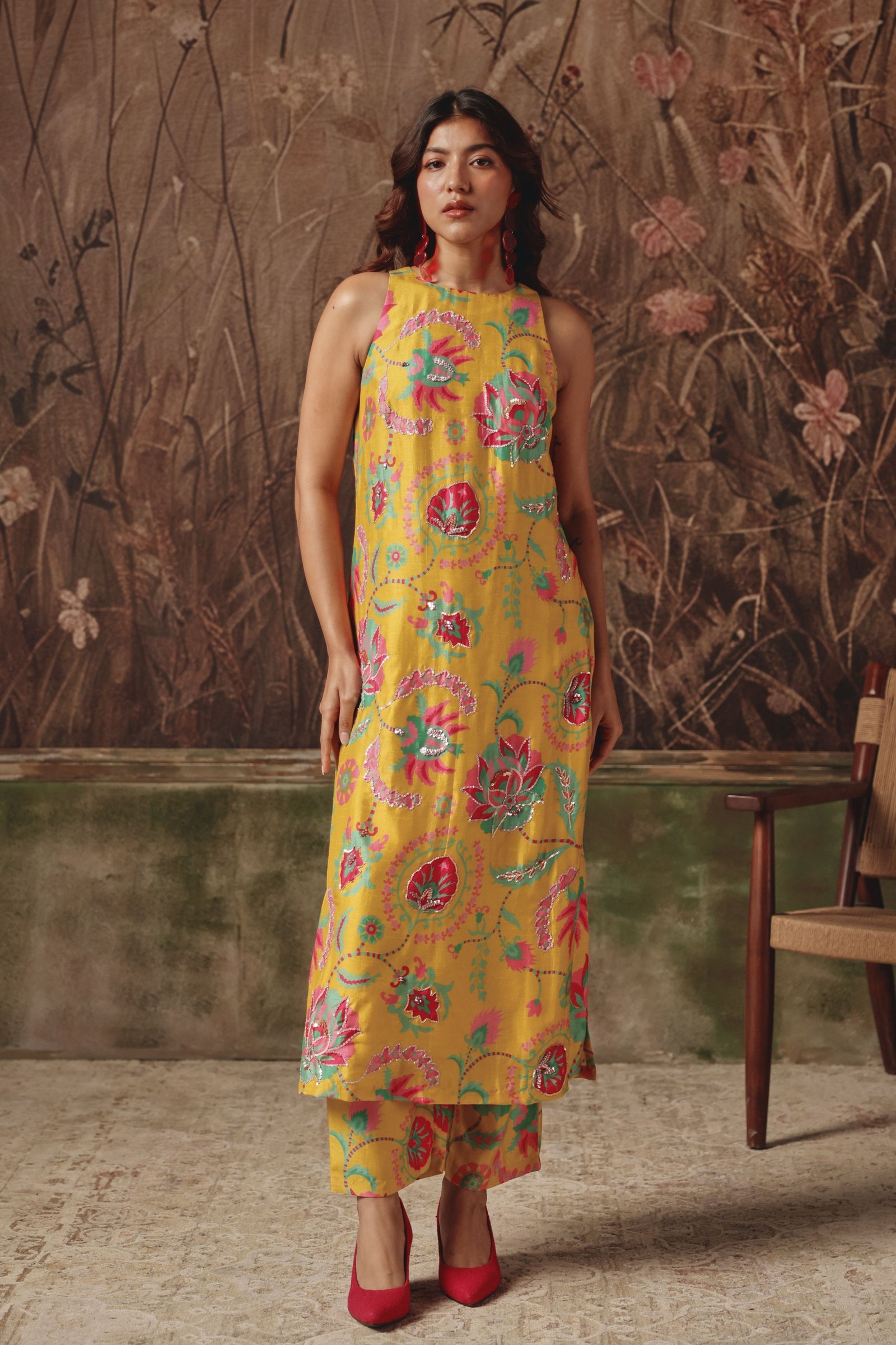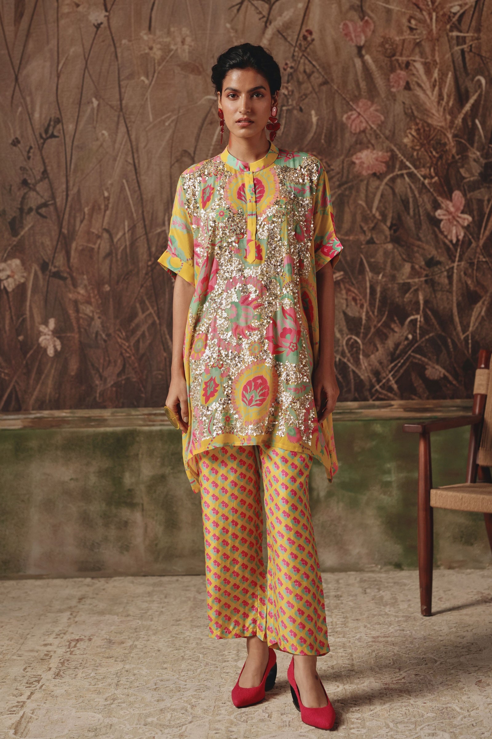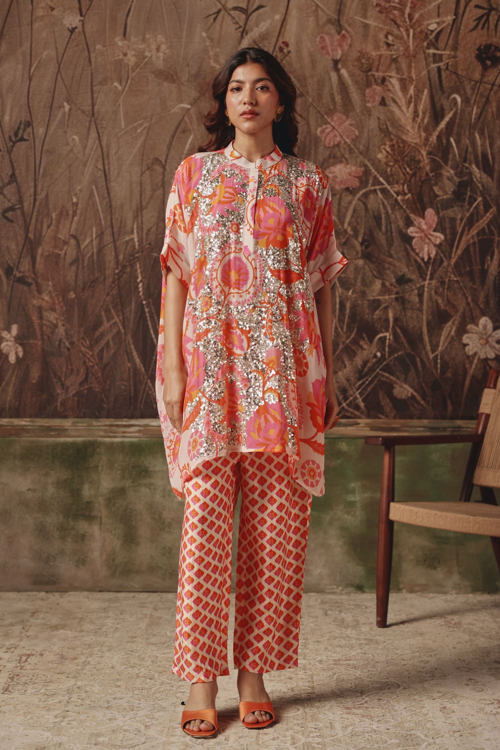 • An ode to petals carried across silk road winds, this ivory-toned kurta set brings soft colour and lyrical florals into a fluid silhouette. The kurta meets a free-flowing sharara and a sheer dupatta, creating a look that feels weightless yet full of story.