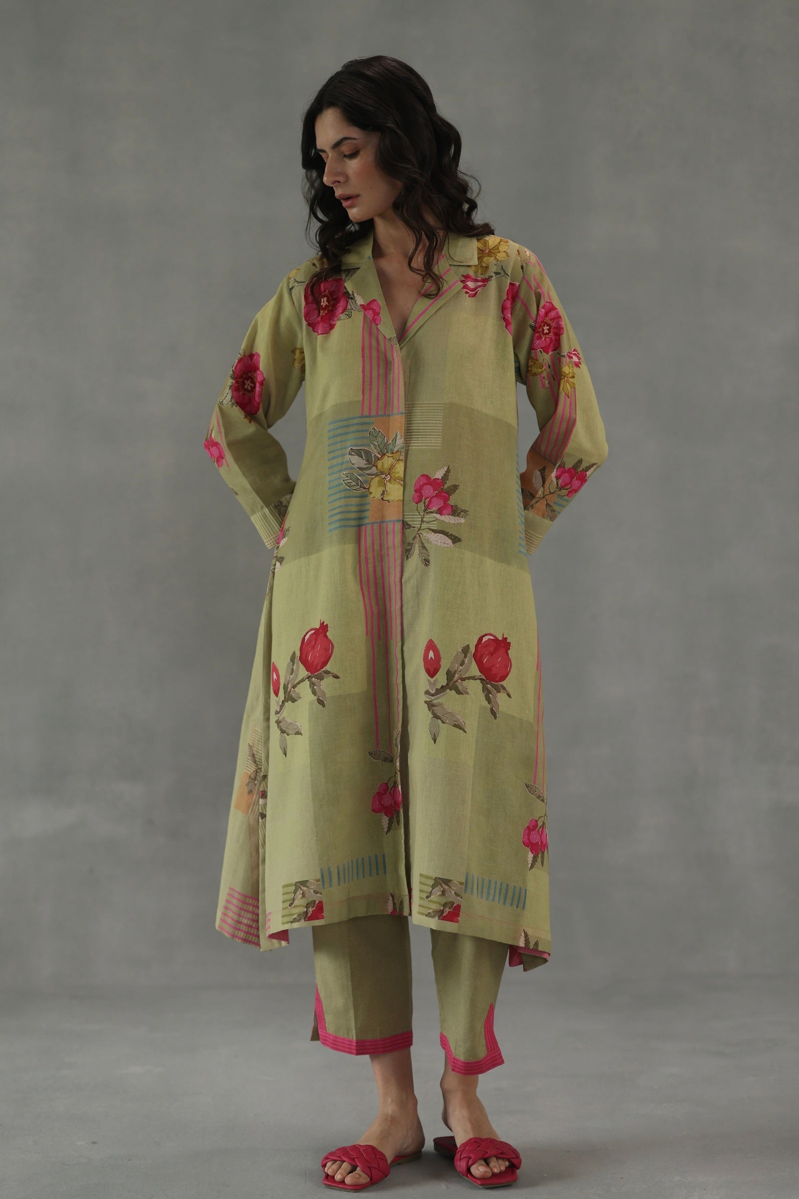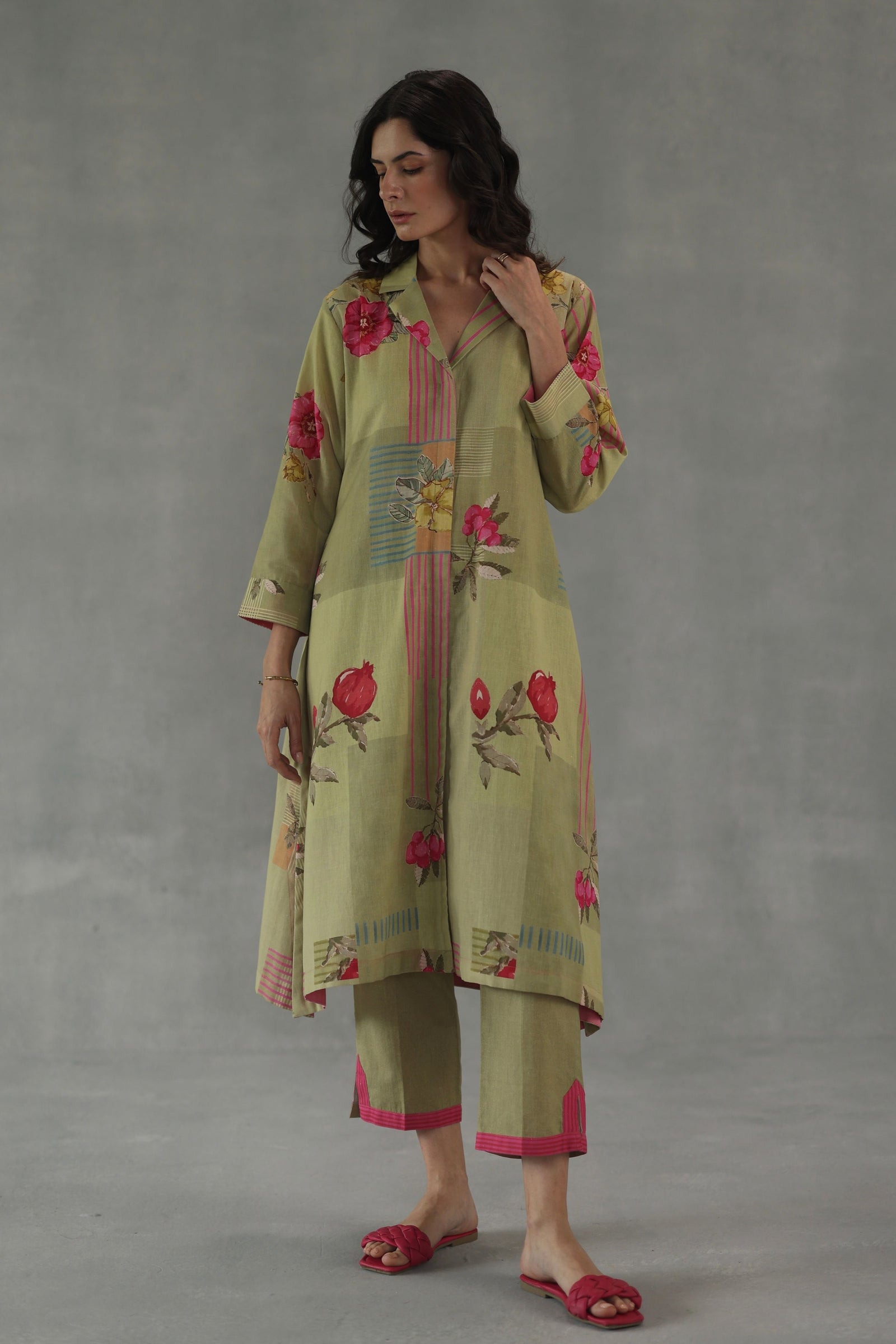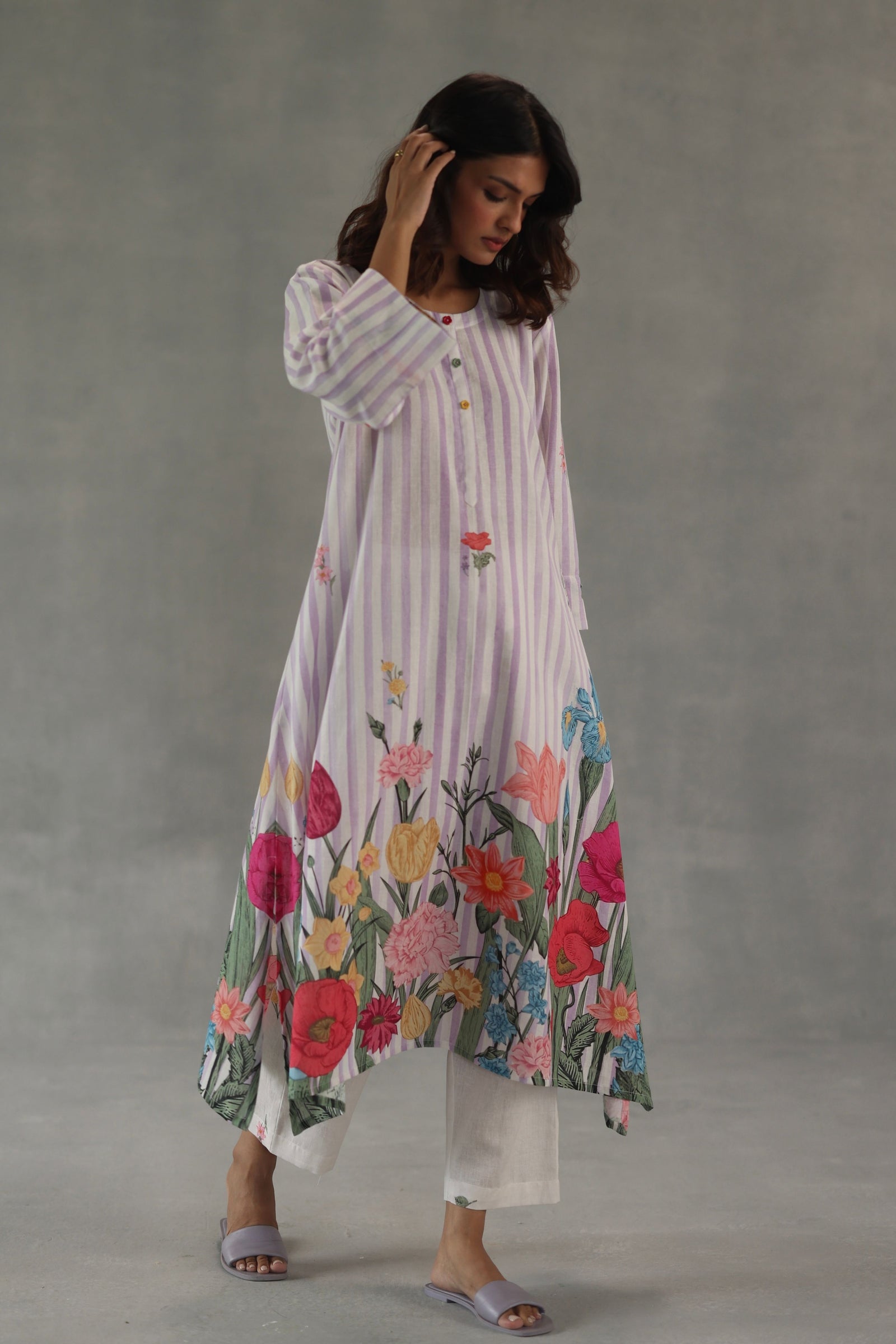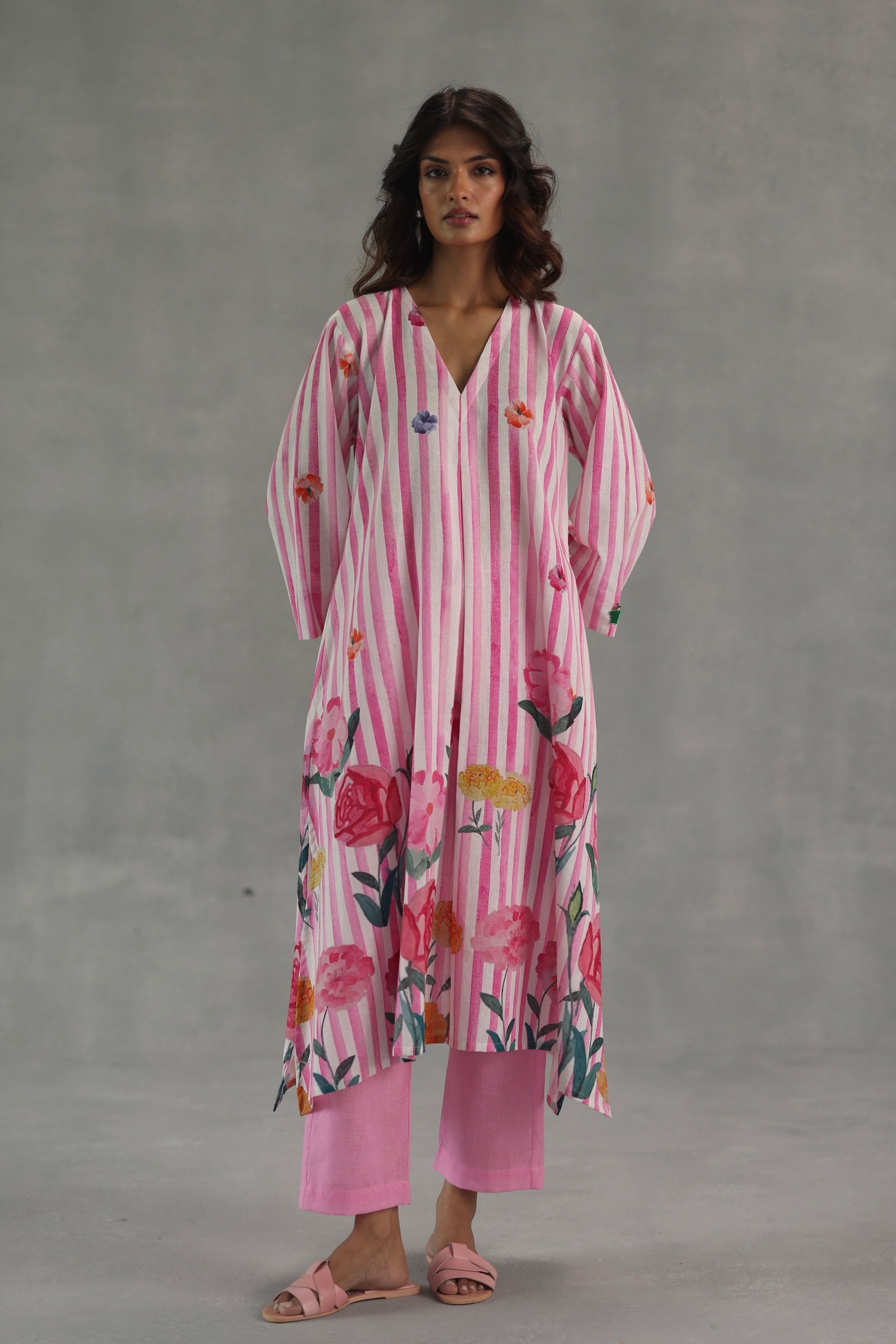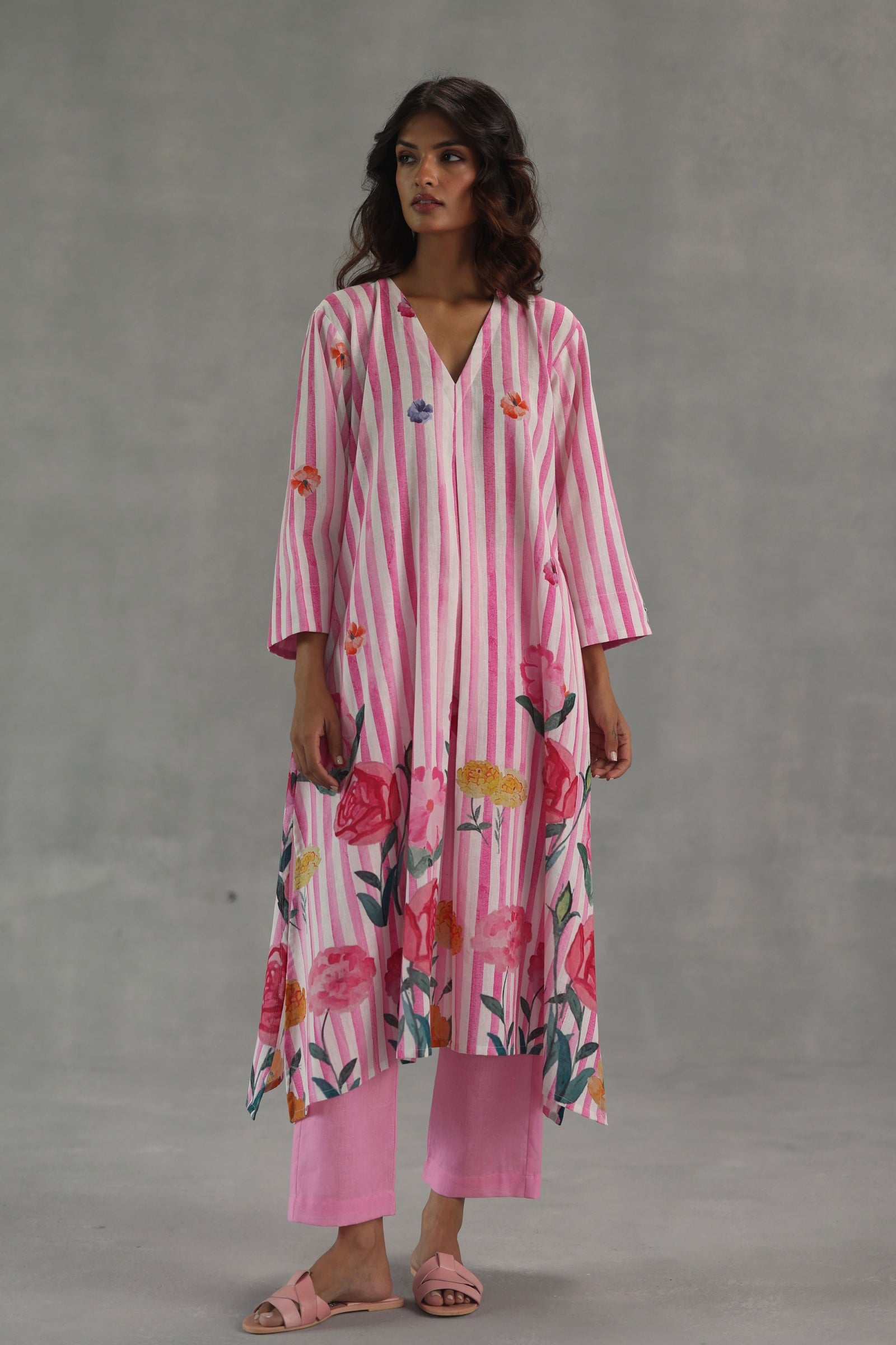 • The Water Lily kurta is a breezy kurta in linen with watercolor bunch of flowers across the sweep. The kurta is an a-line silhouette and opens up in pleats along with the roza signature buttons to add a colourful pop. Pair with the water lily pants for that favourite outfit in your closet.