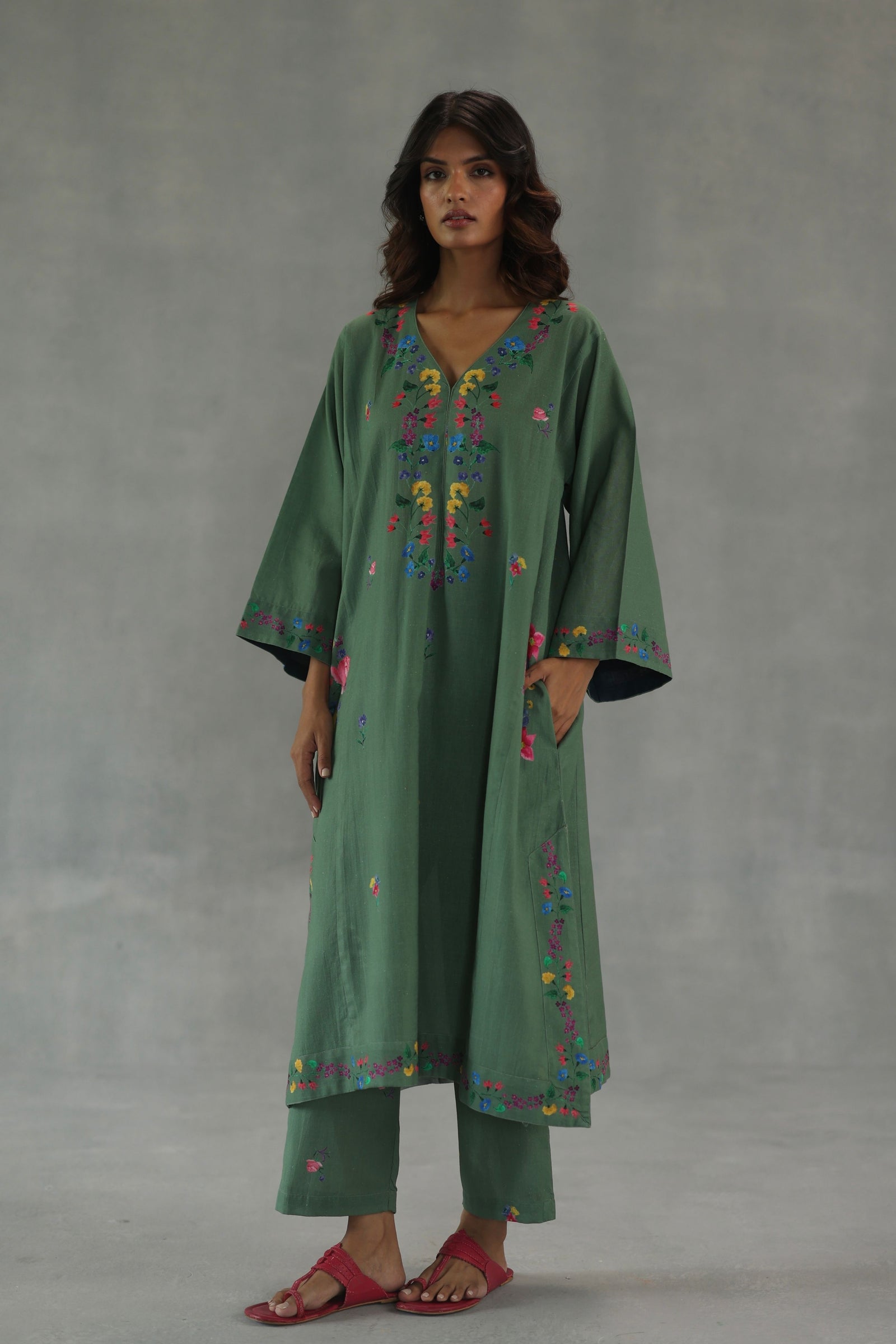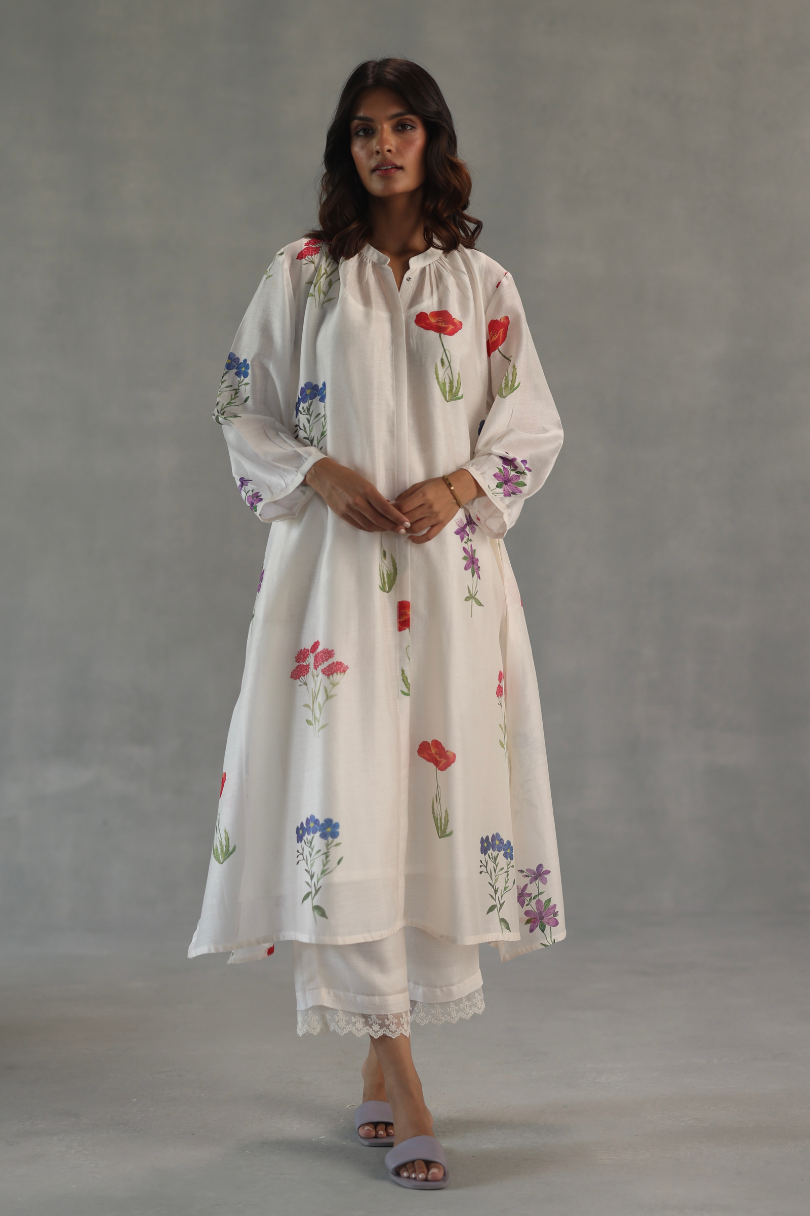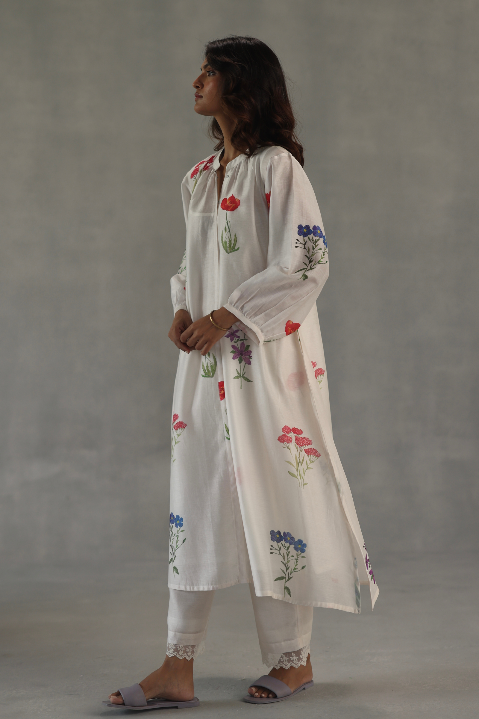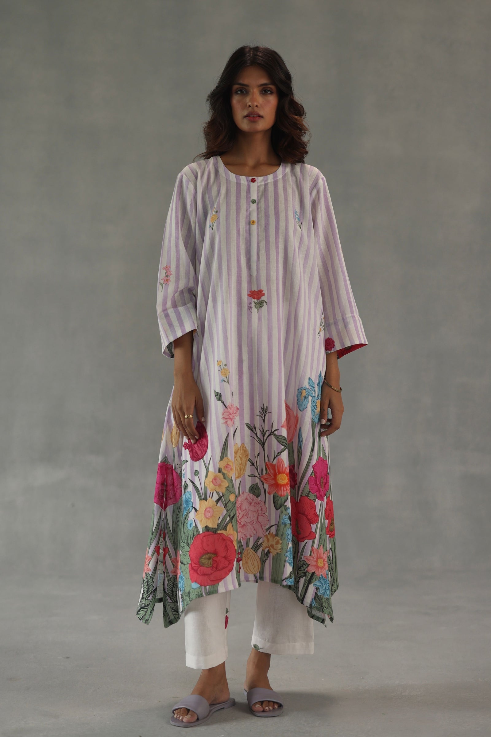 • The Water Lily kurta is a breezy kurta in linen with watercolor bunch of flowers across the sweep. The kurta is an a-line silhouette and opens up in pleats along with the roza signature buttons to add a colourful pop. Pair with the water lily pants for that favourite outfit in your closet.