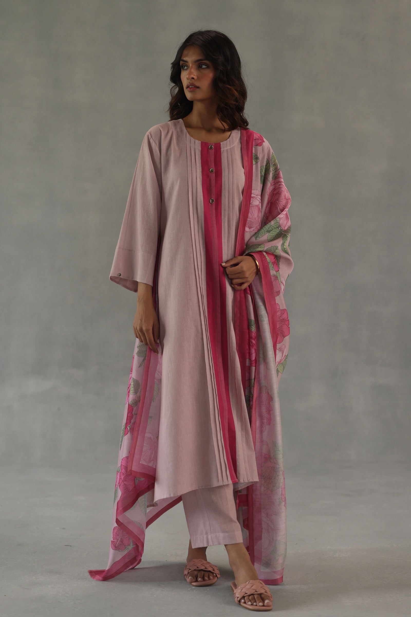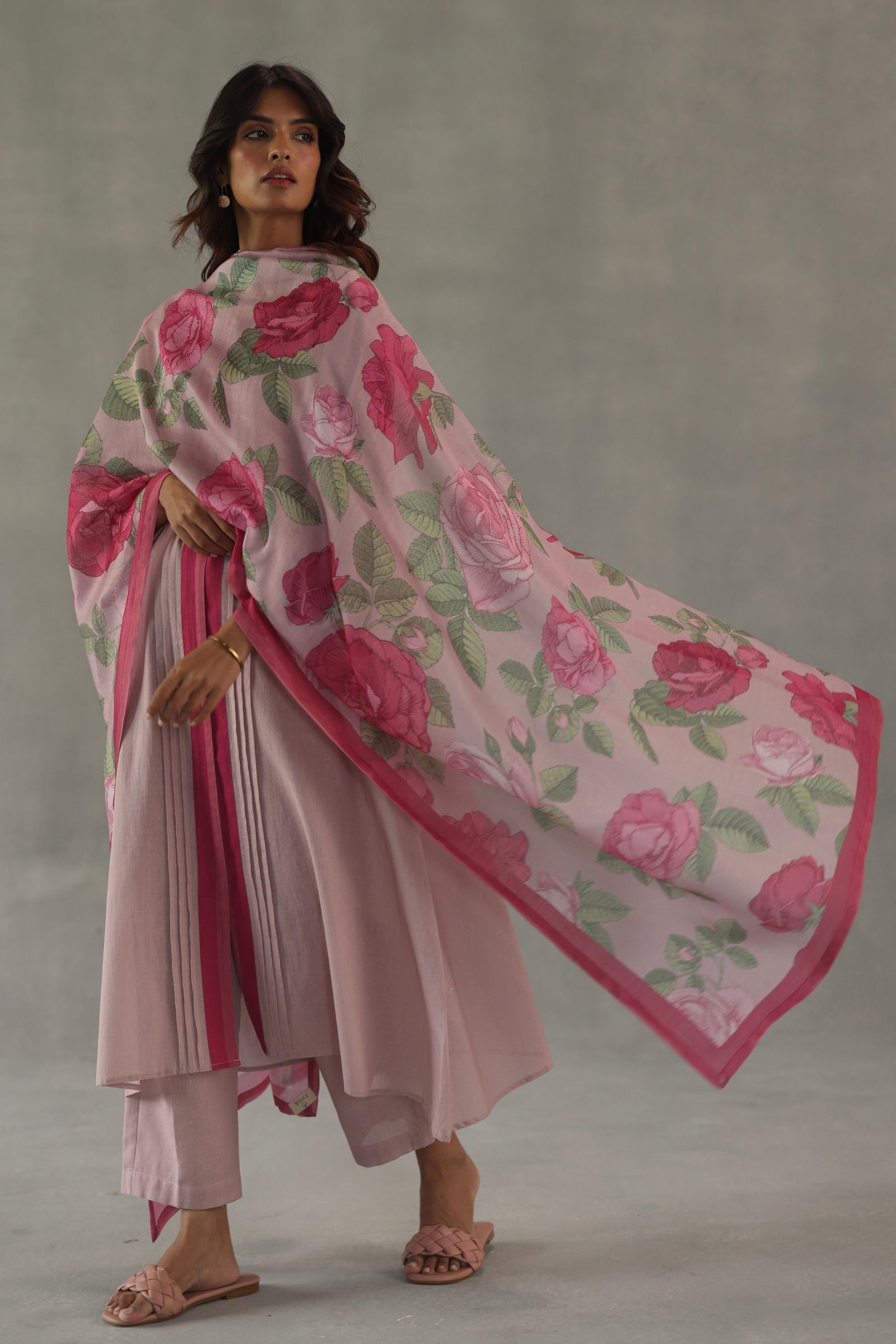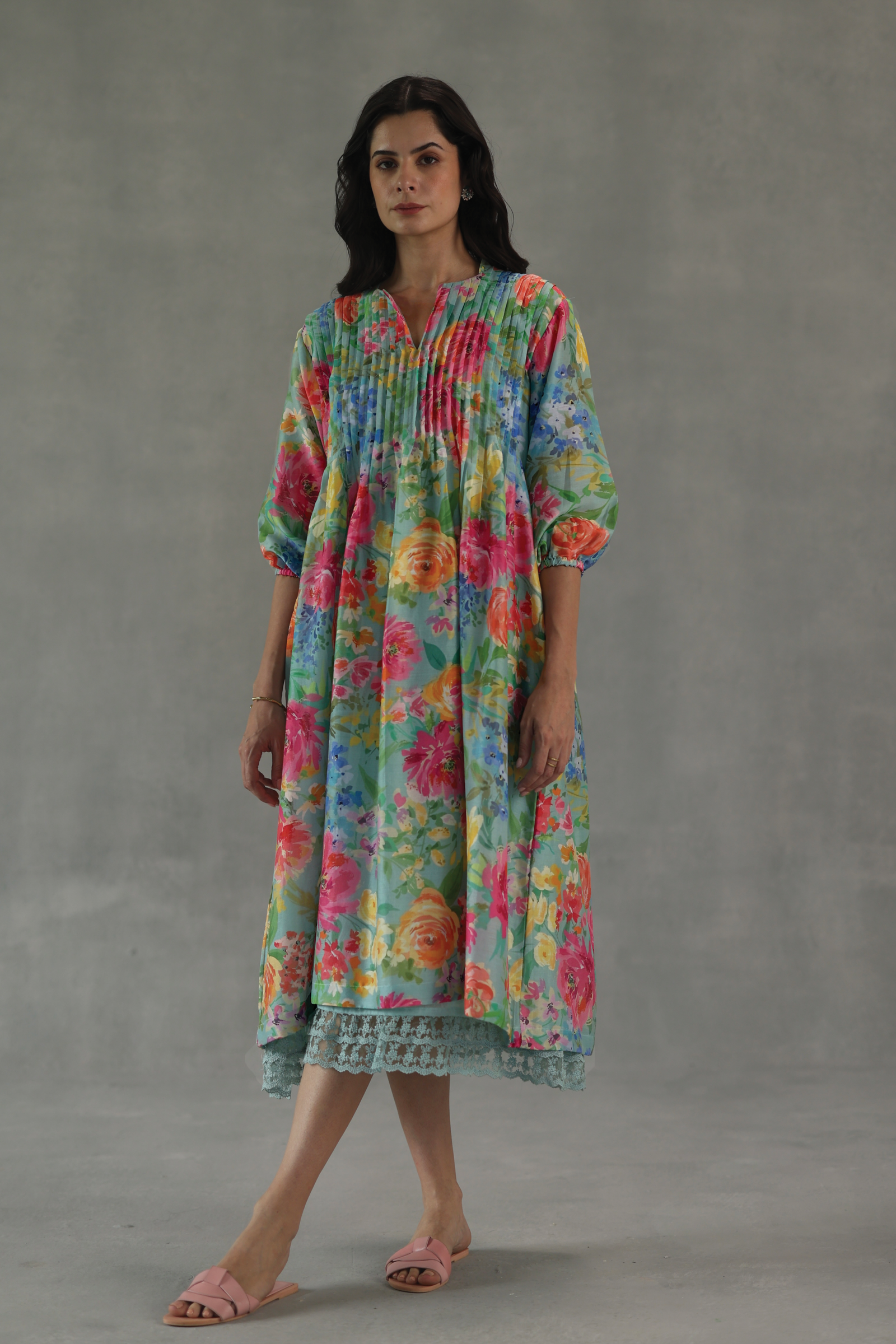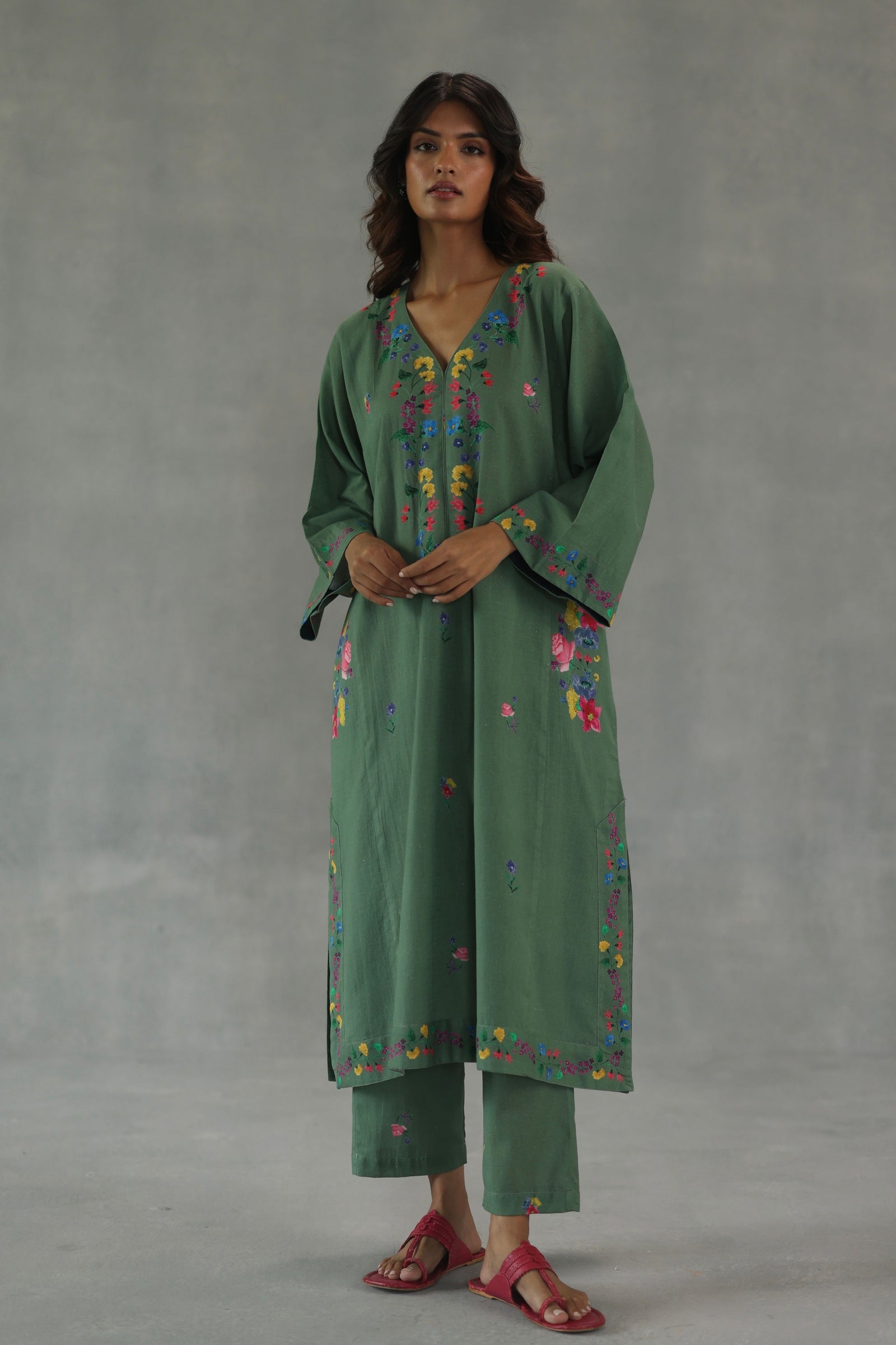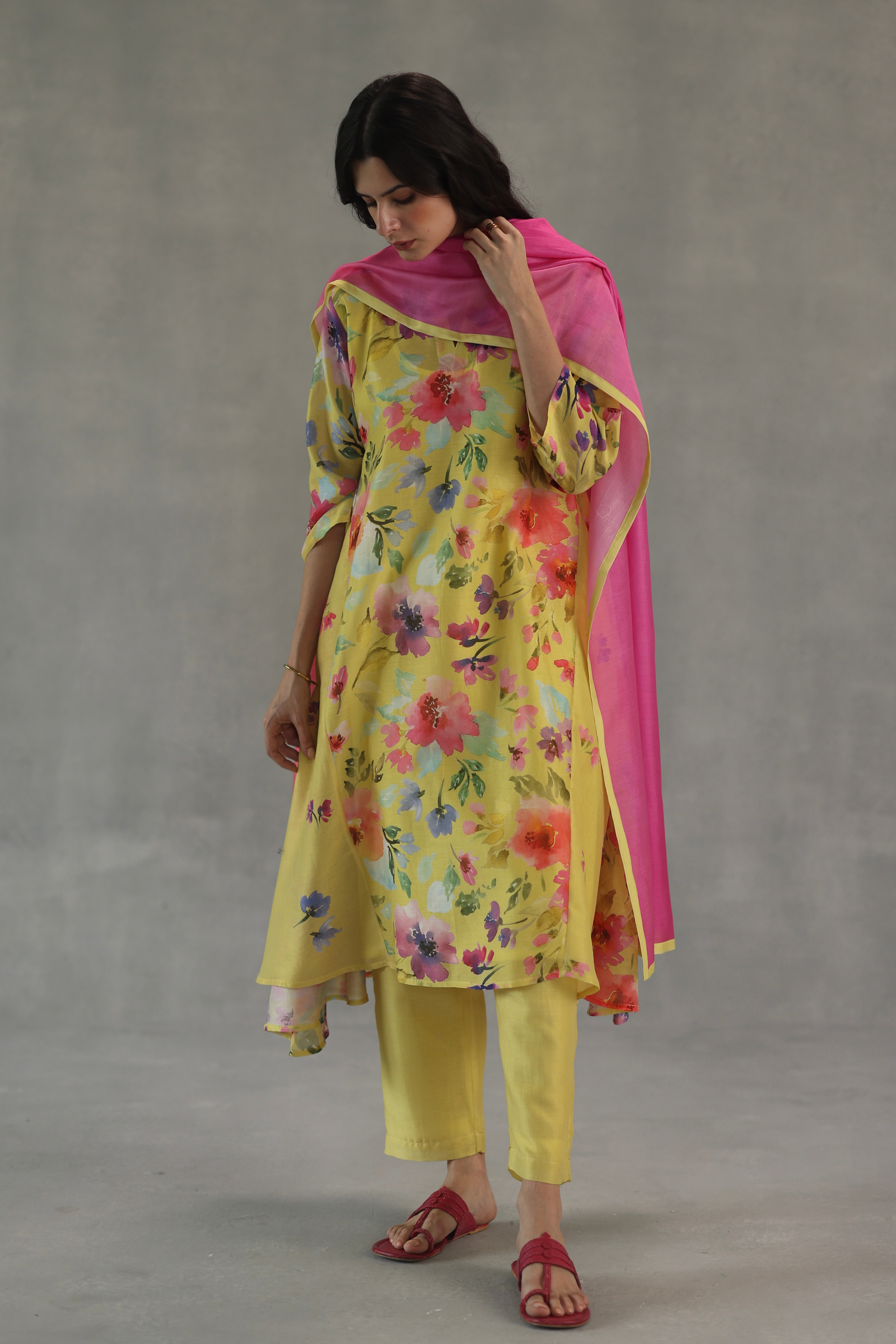 • The Water Lily kurta is a breezy kurta in linen with watercolor bunch of flowers across the sweep. The kurta is an a-line silhouette and opens up in pleats along with the roza signature buttons to add a colourful pop. Pair with the water lily pants for that favourite outfit in your closet.
