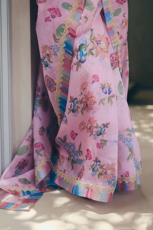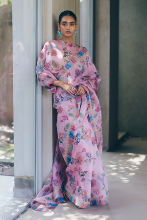 • Step into timeless elegance with this printed organza saree, designed to blend tradition with contemporary charm. Crafted from diaphanous organza, our yasmin saree is crafted in the season's signature floral print. Finished with a refined stripes border and paired with out maria top as a blouse. A perfect choice for women who love understated glamour with a touch of freshness and the saree comes with a petticoat