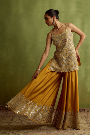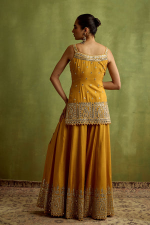 • Yellow silk kurta sharara set embroidered with zari mirrorwork