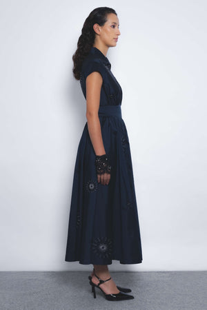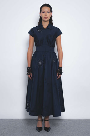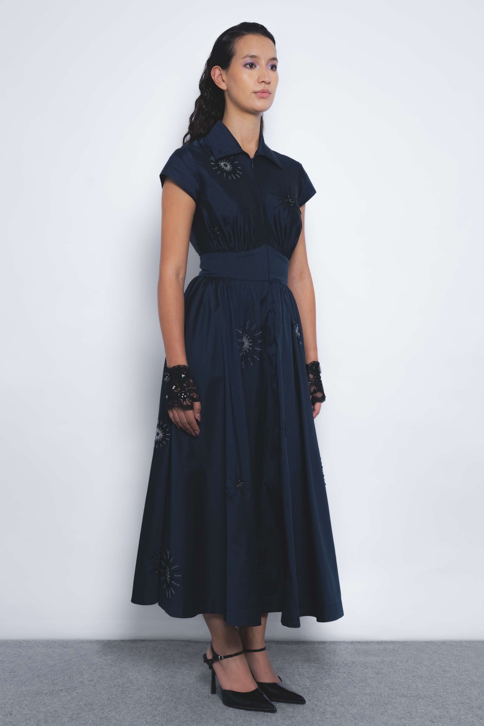 • This classic cinched-waist silhouette with a voluminous hemline, crafted in lustrous taffeta, exudes elegant richness. Tonal hand-embroidered firework motifs lend subtle, intricate illumination to the textile.
