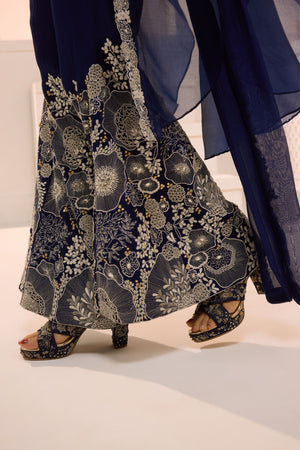 • A vision in deep navy, this exquisitely embroidered ensemble blends timeless craftsmanship with contemporary allure. Designed to command attention with effortless grace, it’s a statement of refined glamour for the modern muse.