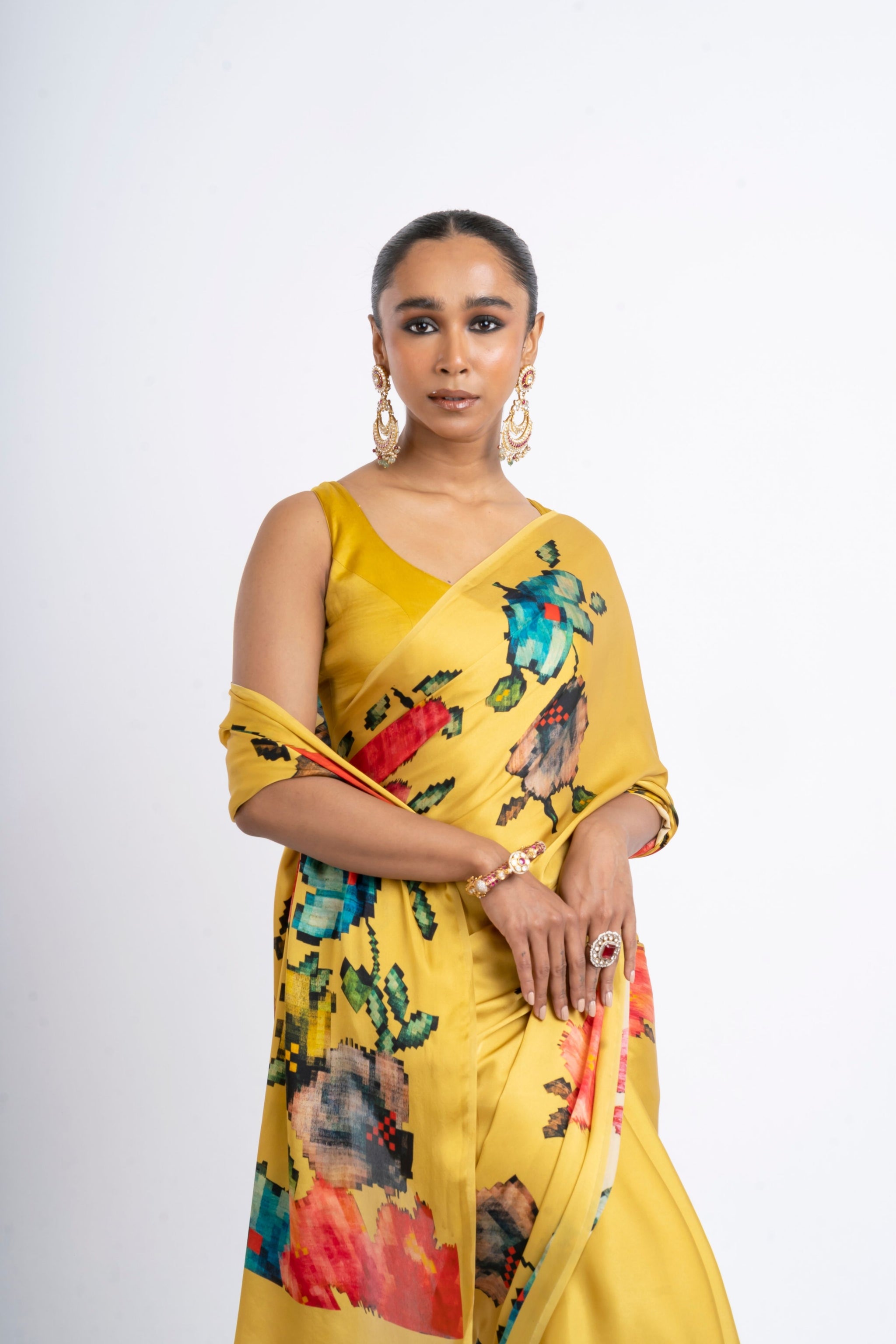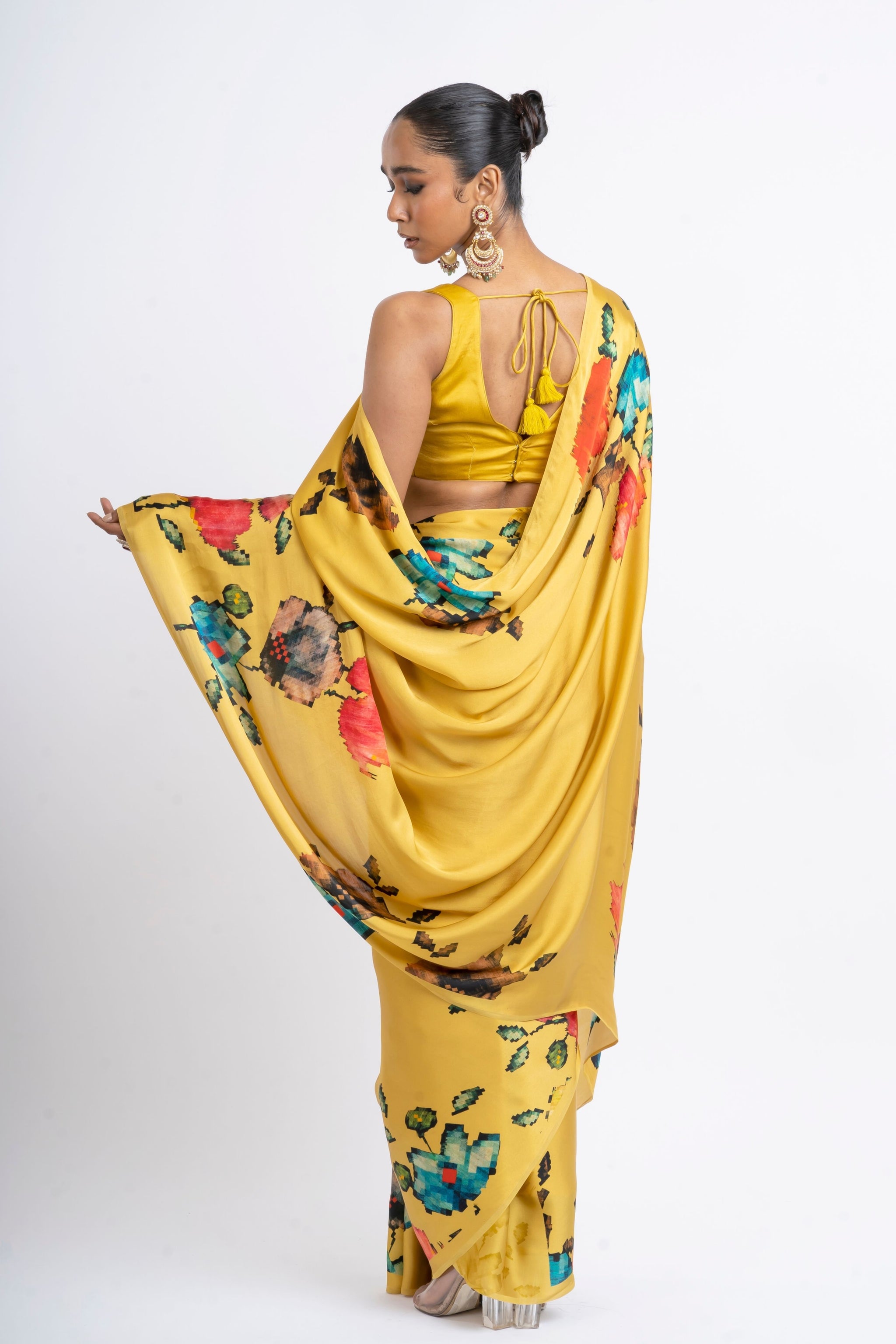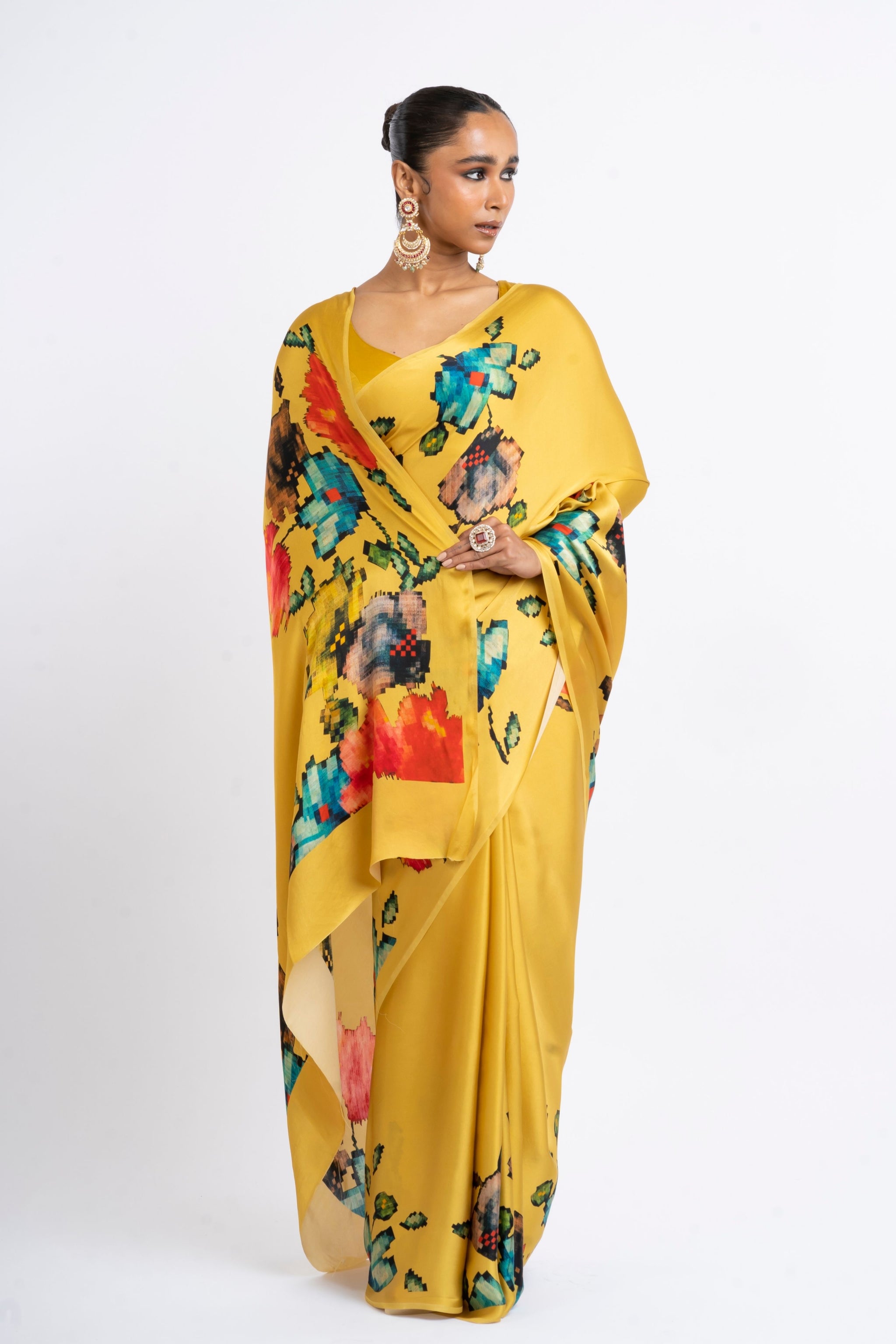 • This pure satin silk saree combines a classic amber base with pixelated Patola weave prints, rendered with contemporary digital flair. The interplay of bold hues against the warm amber fabric creates an eye-catching and elegant ensemble.