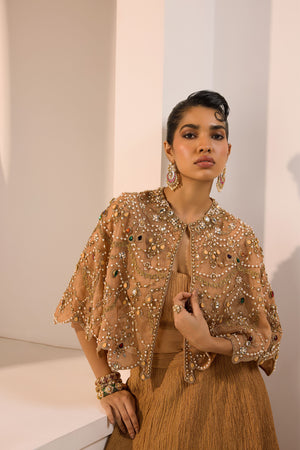 • This striking antique gold ensemble pairs a floor-sweeping, crushed tissue skirt with a regal, scalloped-edge cape. The cape is lavishly adorned with intricate gold beadwork and vibrant jewel-toned accents fully by hand, creating a high-drama silhouette that commands attention with every movement.