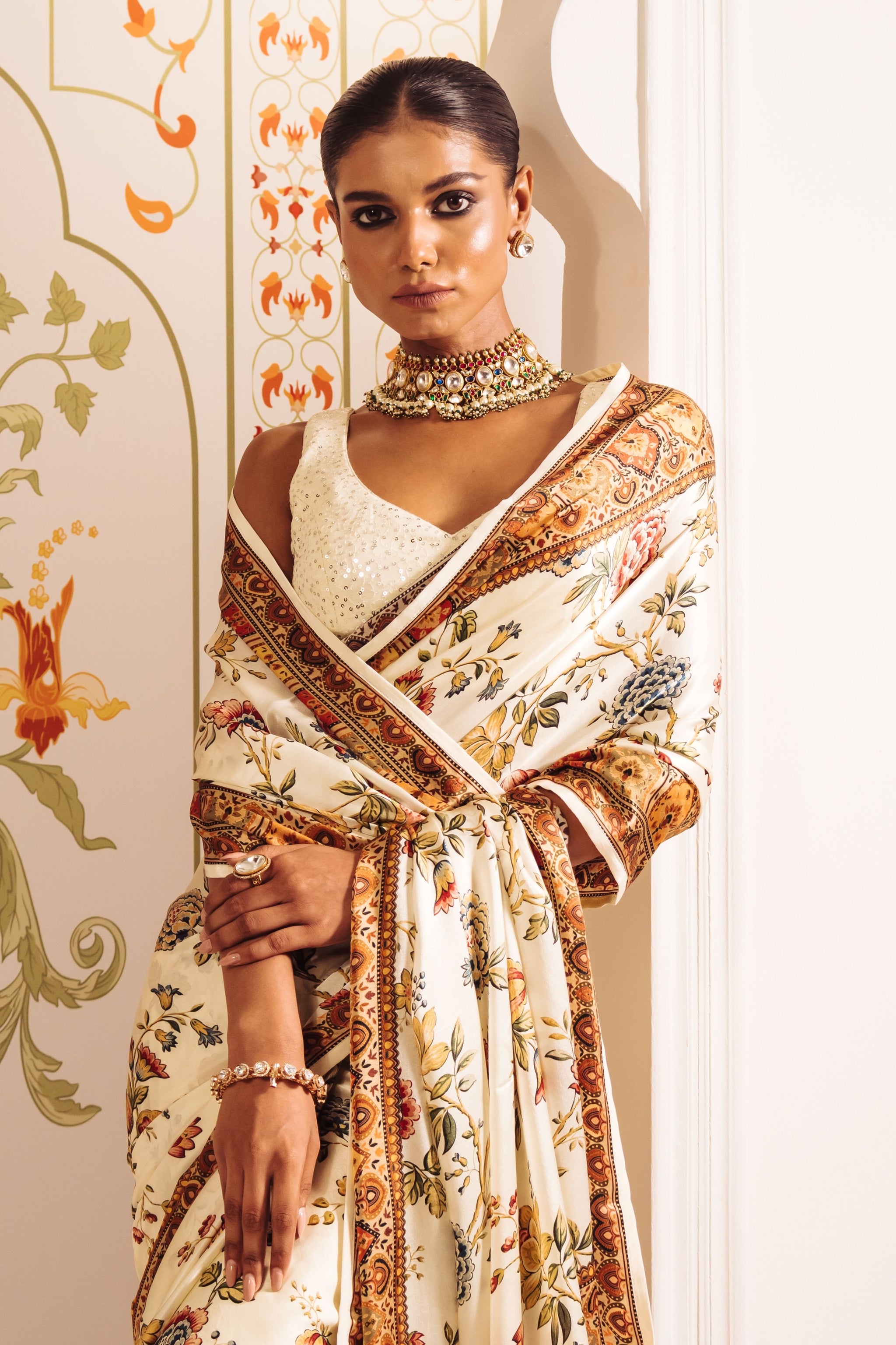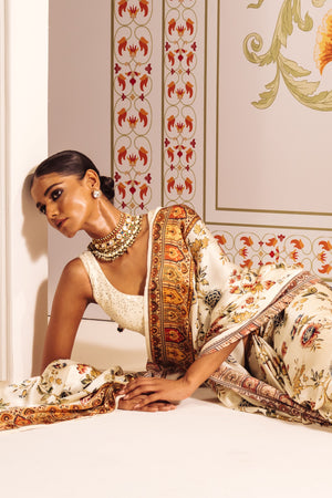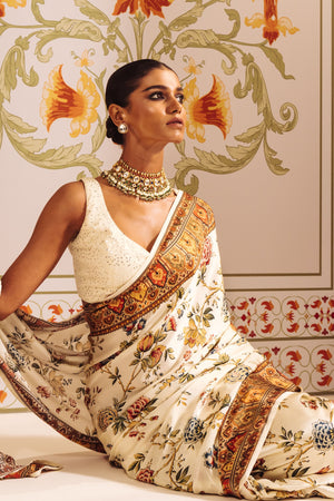 • Featuring a rich white satin silk base, this saree is adorned with a digitally rendered Chintz floral design that bursts with a captivating array of colors.